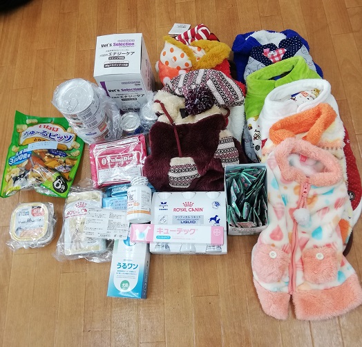 鹿児島県のしろっぷ様より、愛犬ちゃんのためにご用意されていたリキッドや投薬用ちゅーるなどとかわいいワンコ服をご支援頂きました。遠く鹿児島から保護犬達へのあたたかいお気持ちをありがとうございます。大切に活用させていただきます。