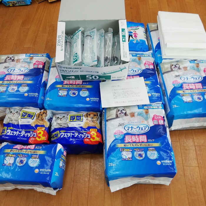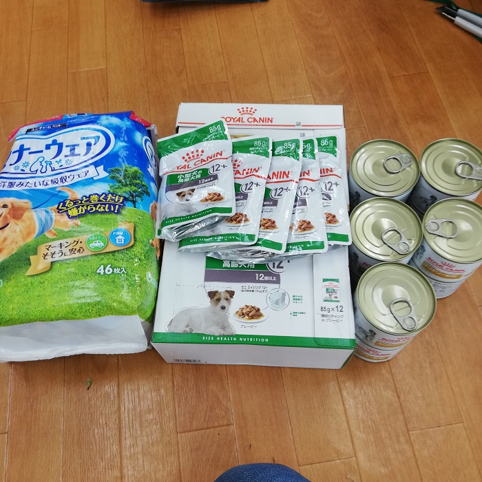 千葉市若葉区の楠様より、おむつ、高齢犬用パウチ、処方食の缶詰などをご支援頂きました。