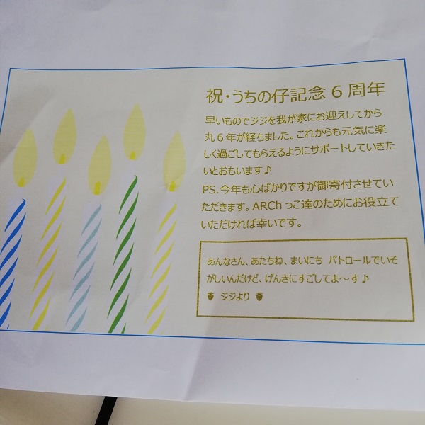幸せ卒業っこヨーキーのジジちゃんのお家から「うちの仔6周年」のお祝いのお福分けにネオオムツとごはんちゅ~る、のご支援をいただきました。