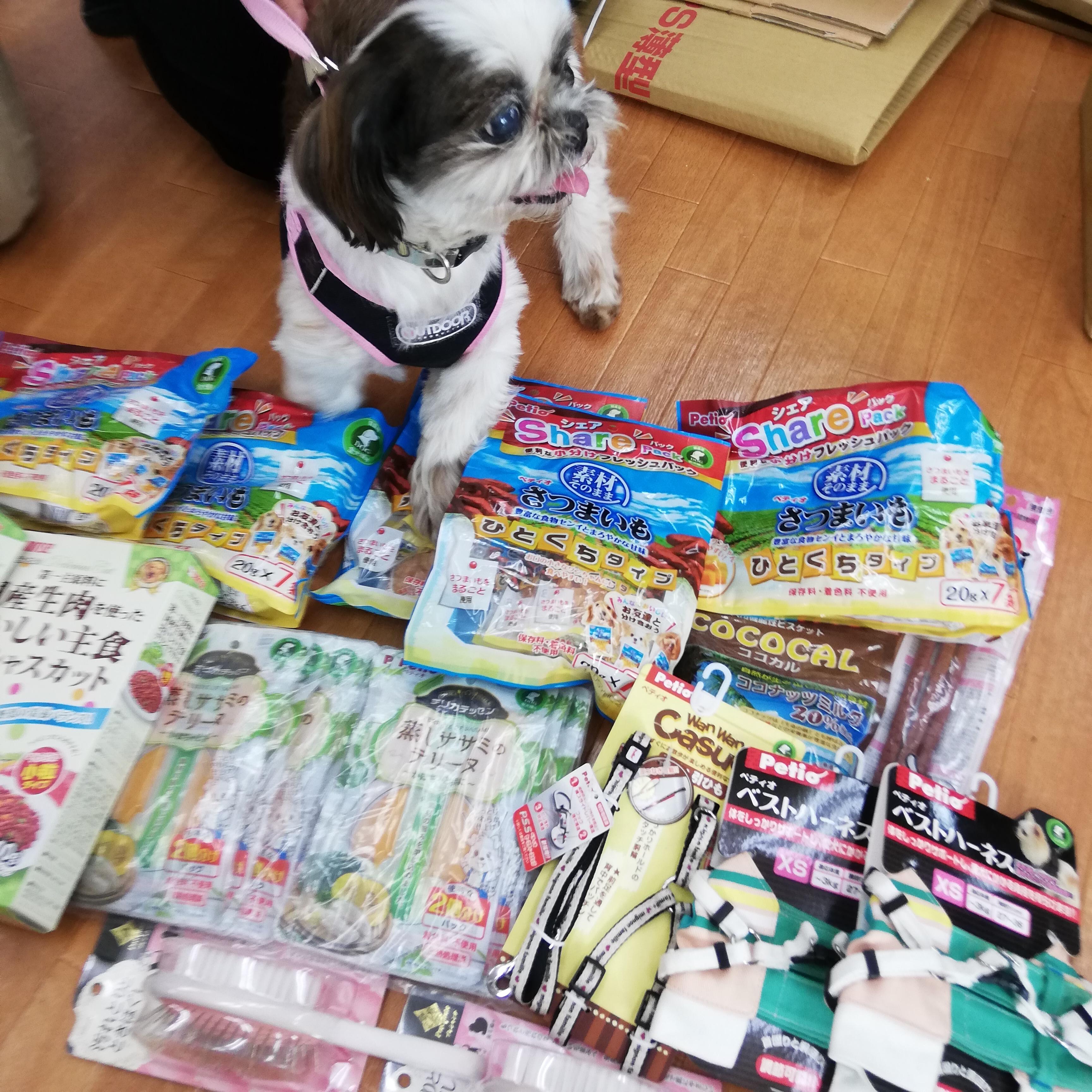 山武市のうめざわ様から、フードやおやつ、ハーネスなどのご支援を頂きました。居合わせてとっぴいもたくさんのおやつに大興奮でした。ARChっこみんなで頂きます。