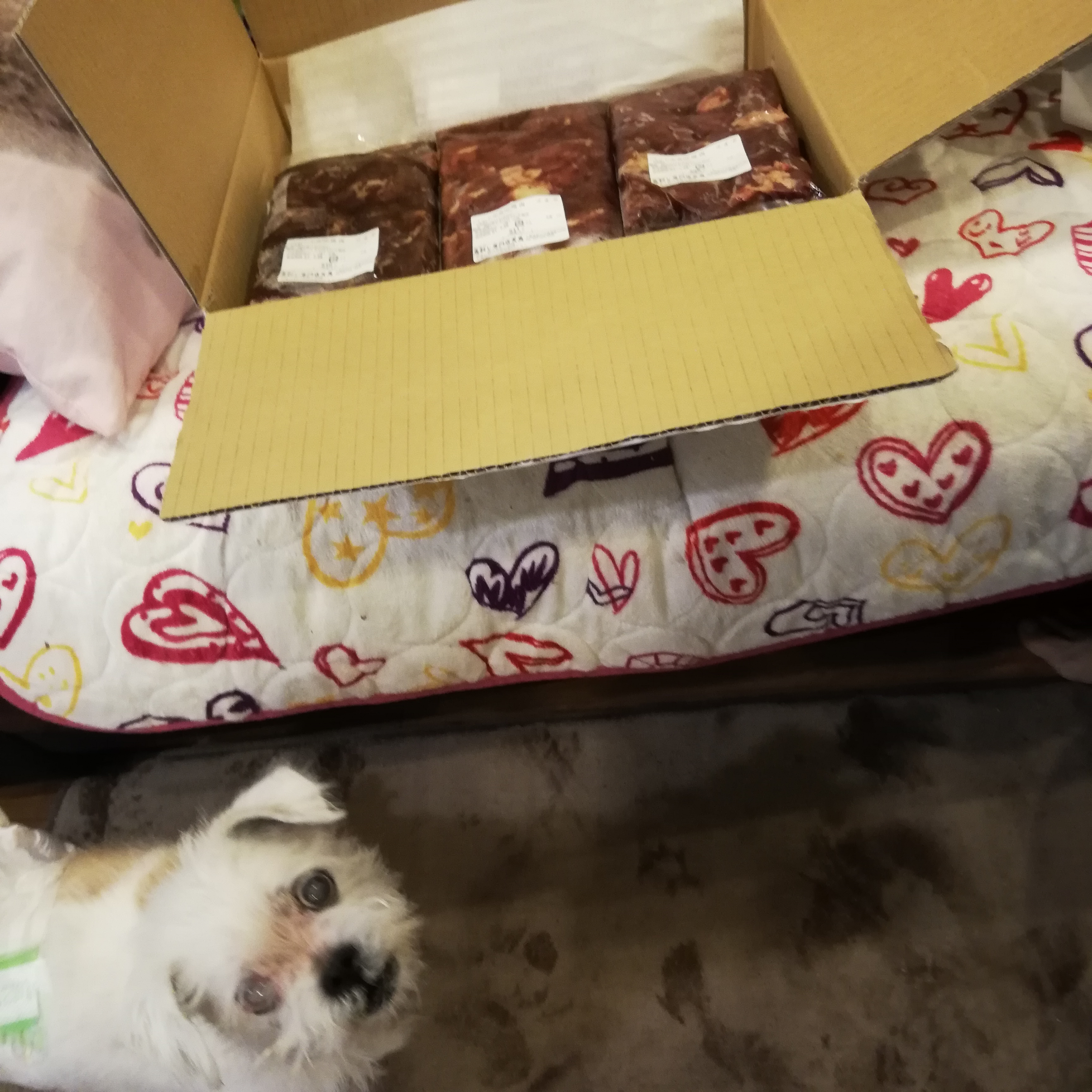 ※箱の横で開けて、開けて、と騒ぐので下ろされたツモ君^^;
