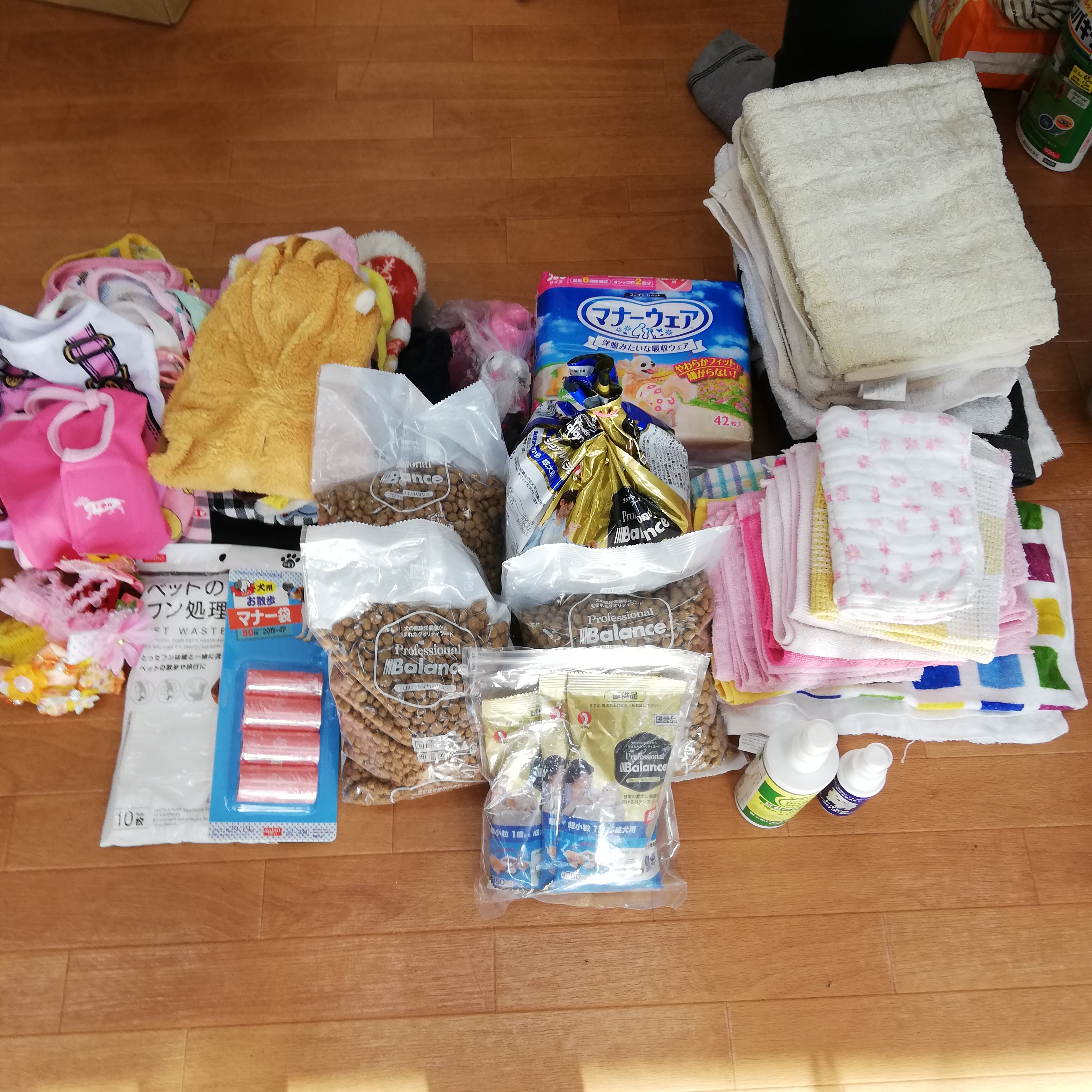 松戸市の野田様が、フードやわんこ服、リードやハーネスなどたくさんのご支援をお届けくださいました。