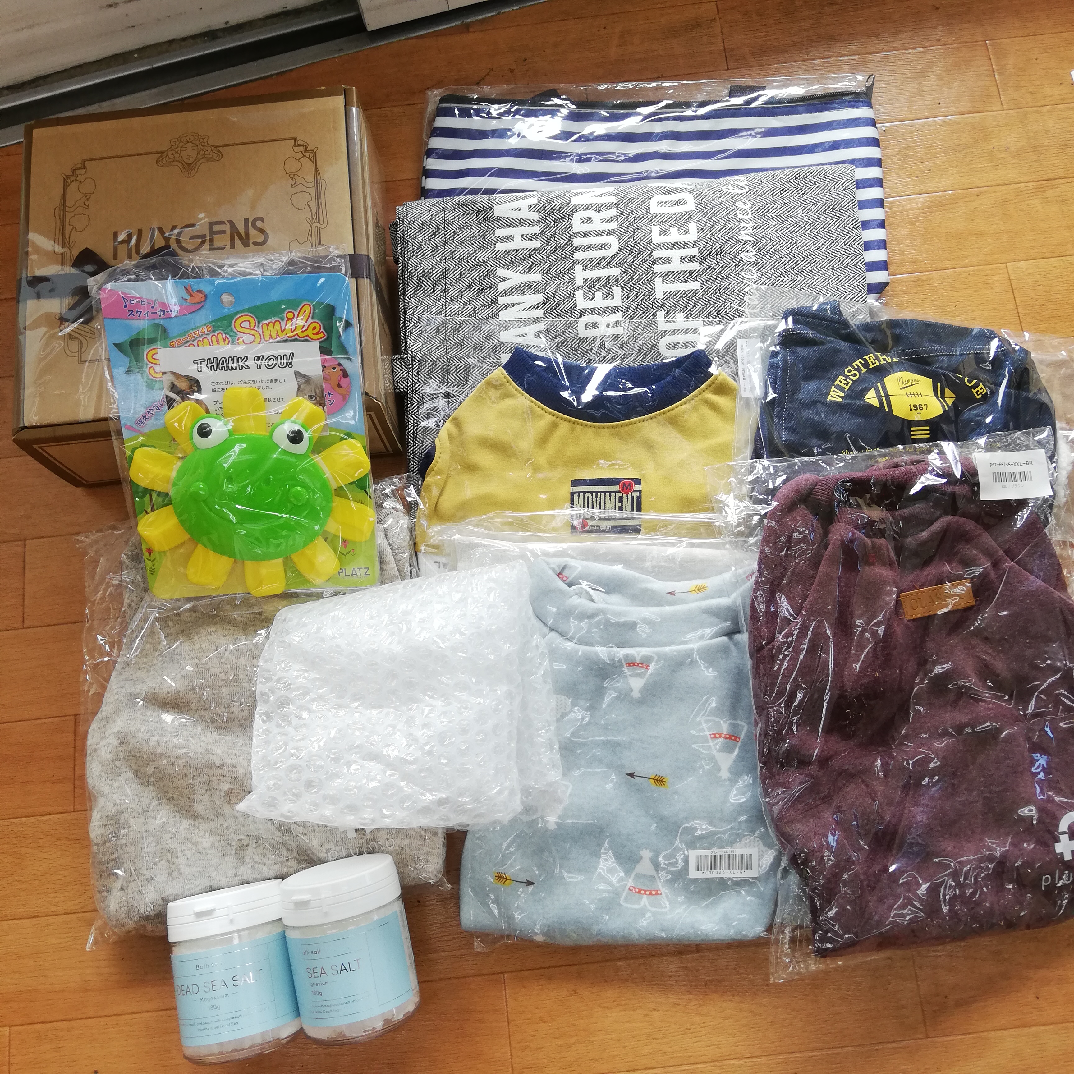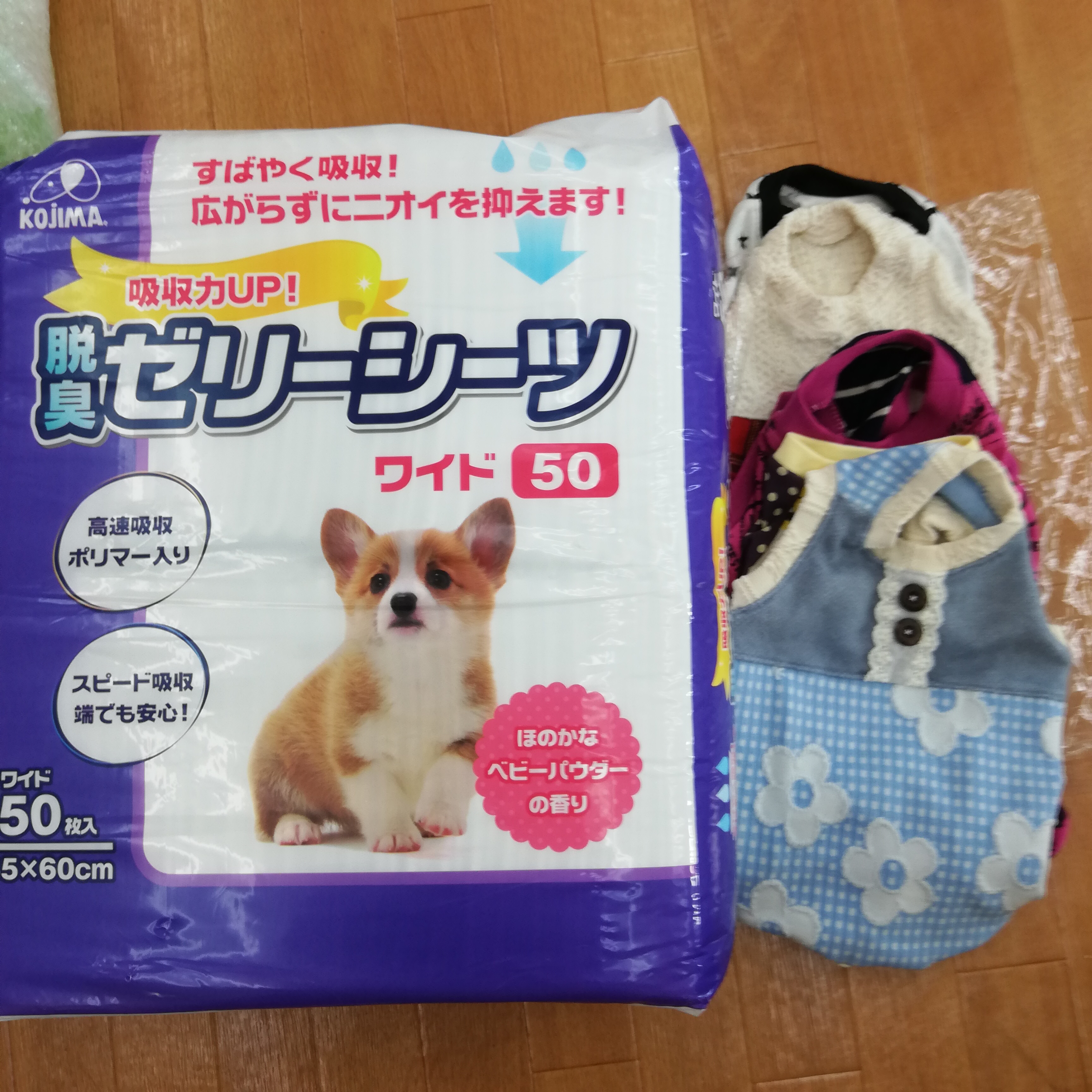 和光市のさき69様より、かわいいワンコ服とシーツのご支援をいただきました。