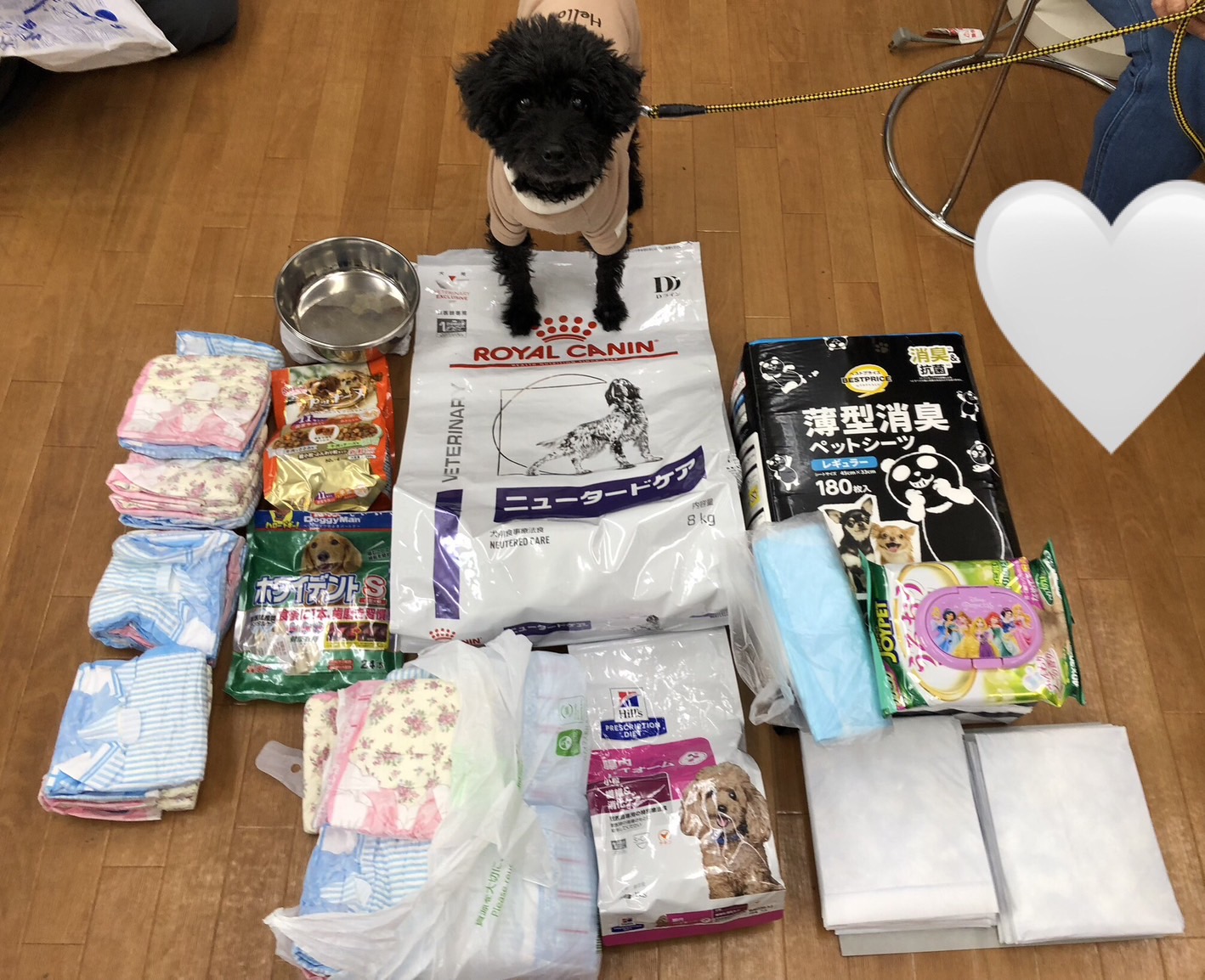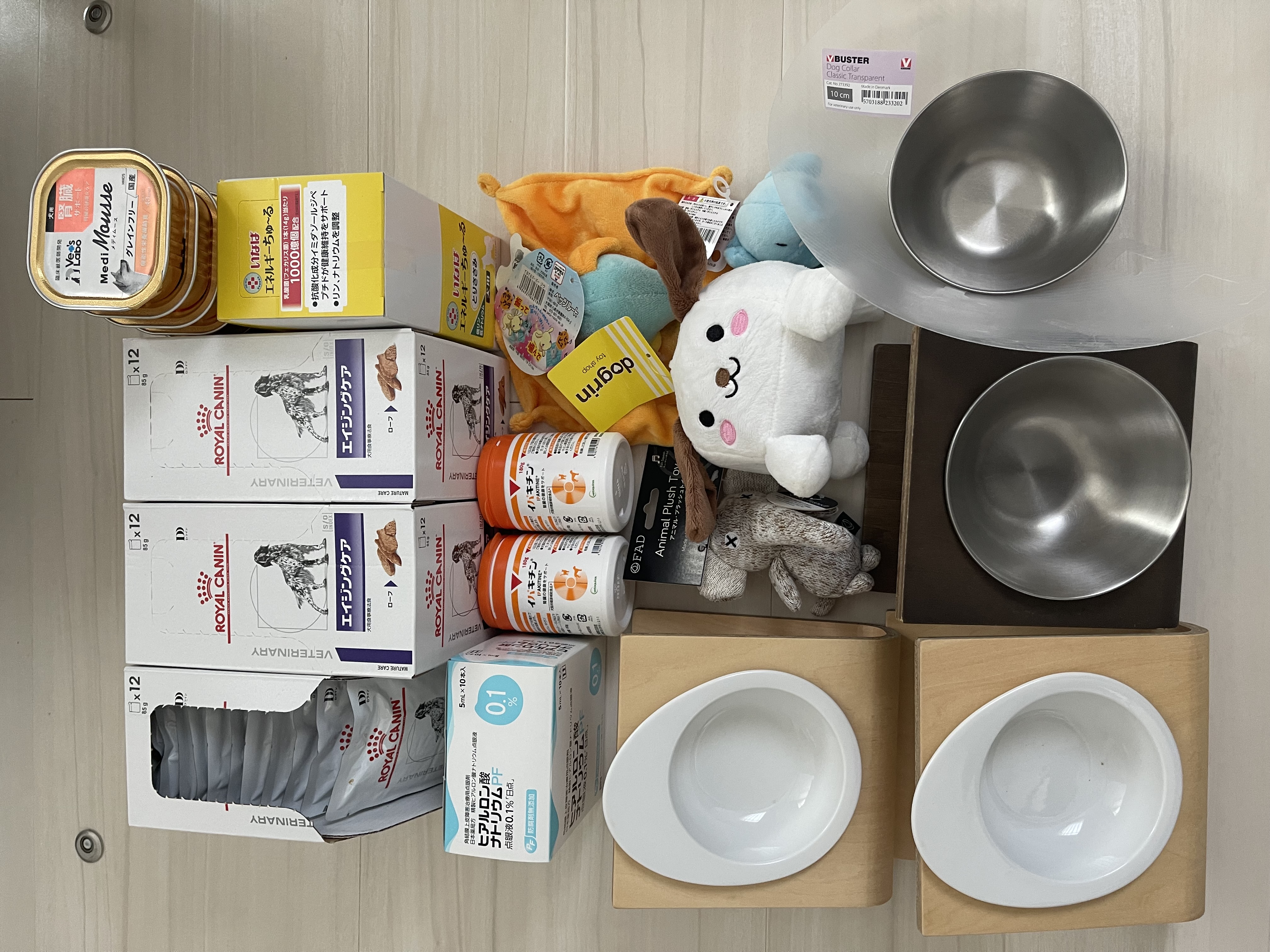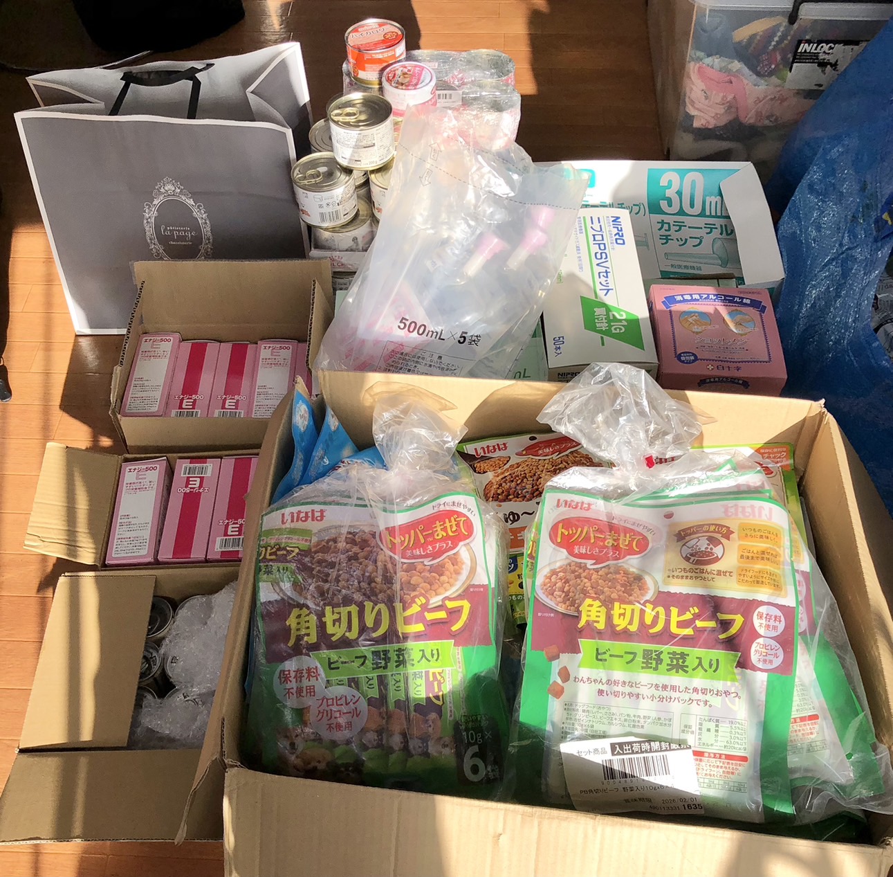 沢山のフードやトイレシーツ、おむつや食器などご支援いただきました。