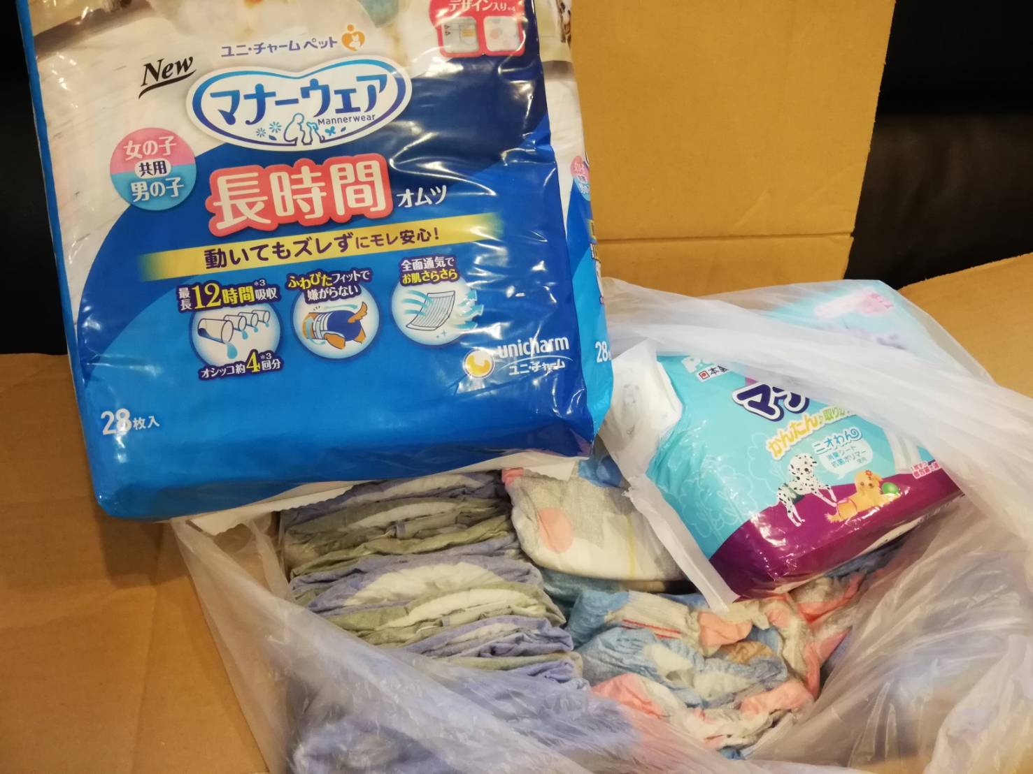大阪府箕面市のチロママ様より、愛犬ちゃんの残されたオムツや処方食などのフード、ペットスェット、フリースなどのご支援を頂きました。フィラリア予防薬もとてもたすかります。