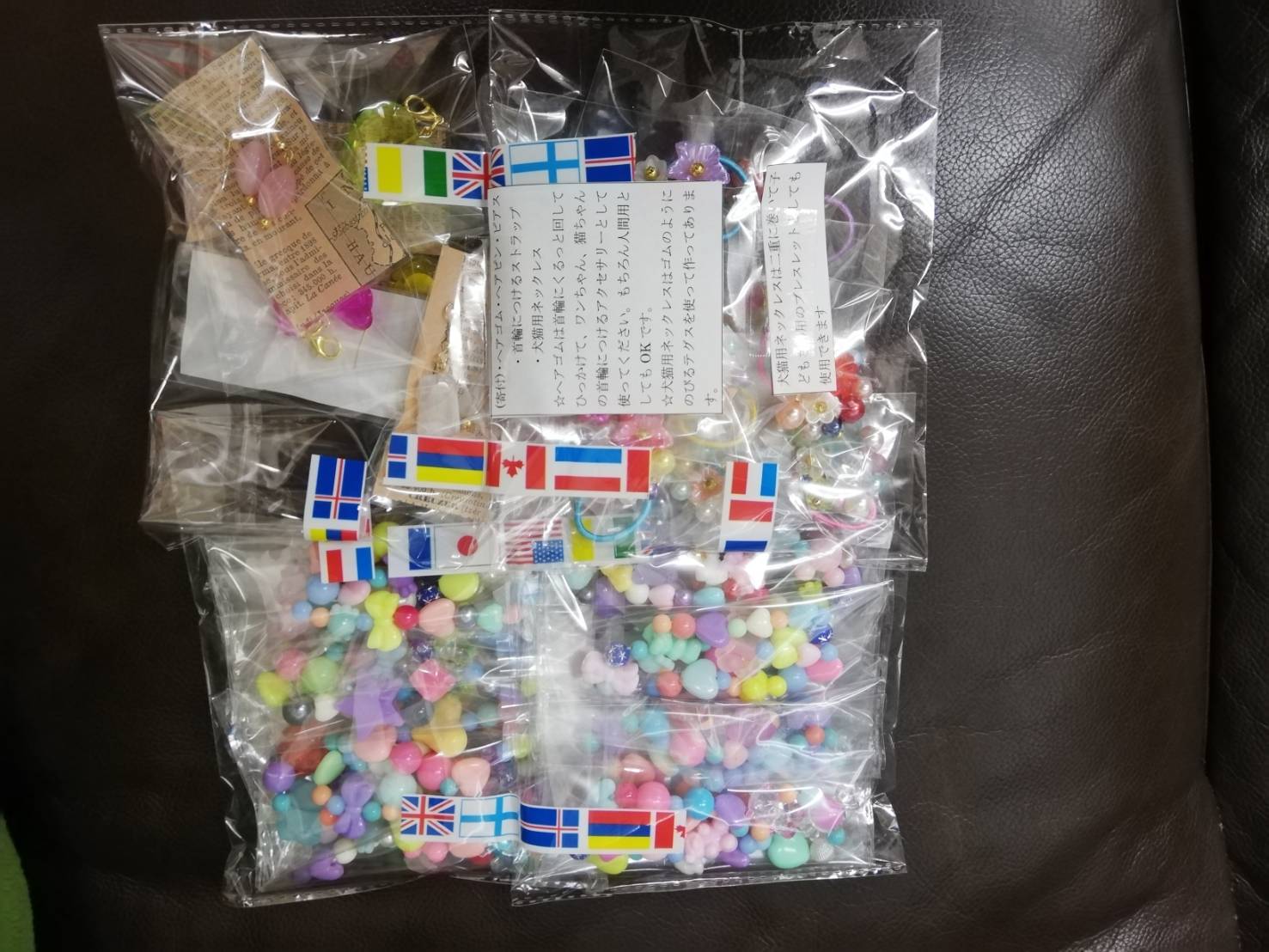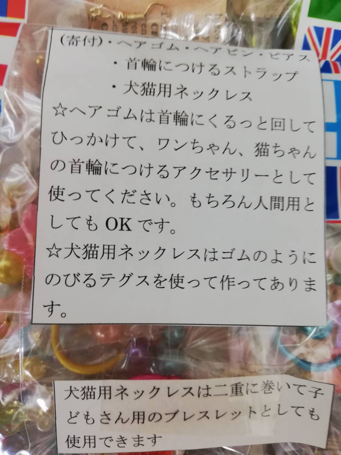 西多摩郡の久下様より、手作りアクサセリーのご支援を頂きました。ヘアゴム、ヘアピン、ワンコのネックネス、ピアスなどとてもきれいでかわいいものをありがとうございます。