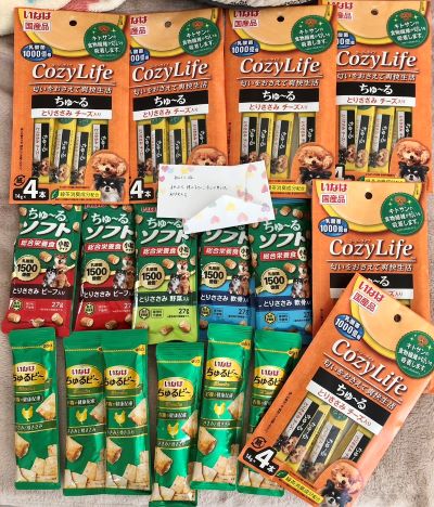 だい&メープル、さっちゃんママ様から、不腸になって食欲がなくなっていたポメママ リラさんに、好んで食べたチーズのケーキなど美味しいものやたくさんのARChっこ達のおやつをいただきました。