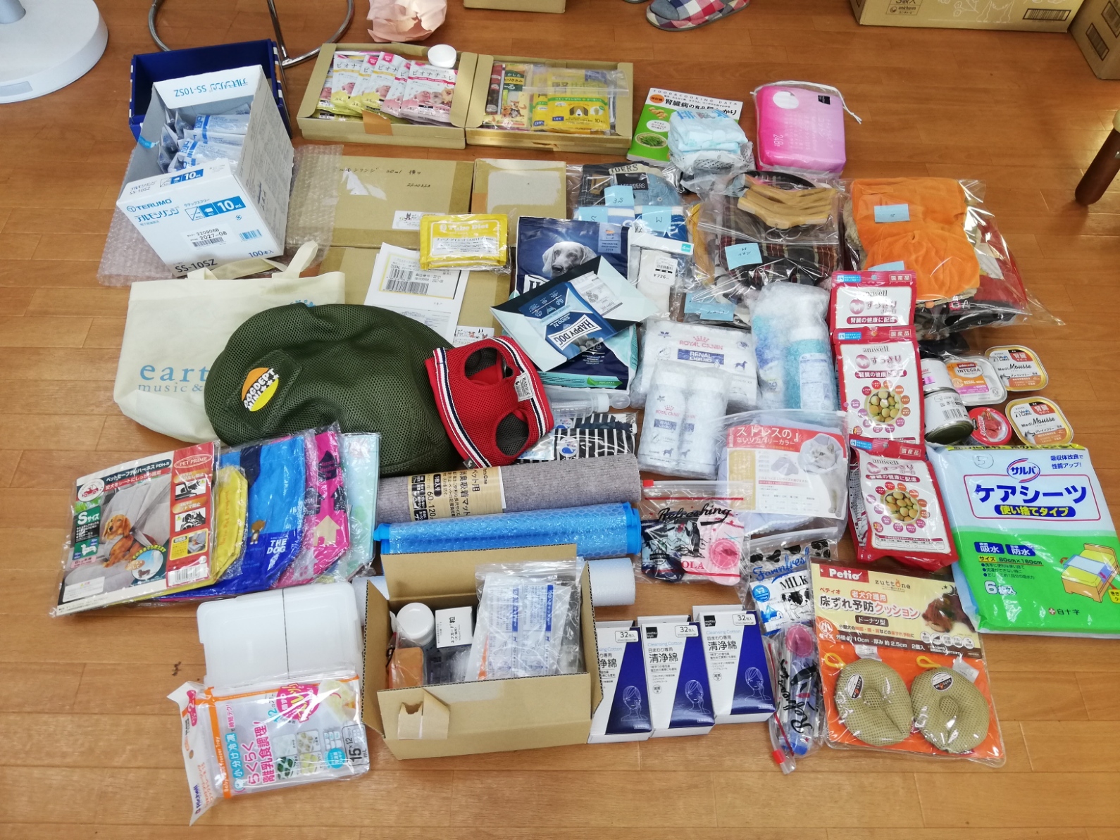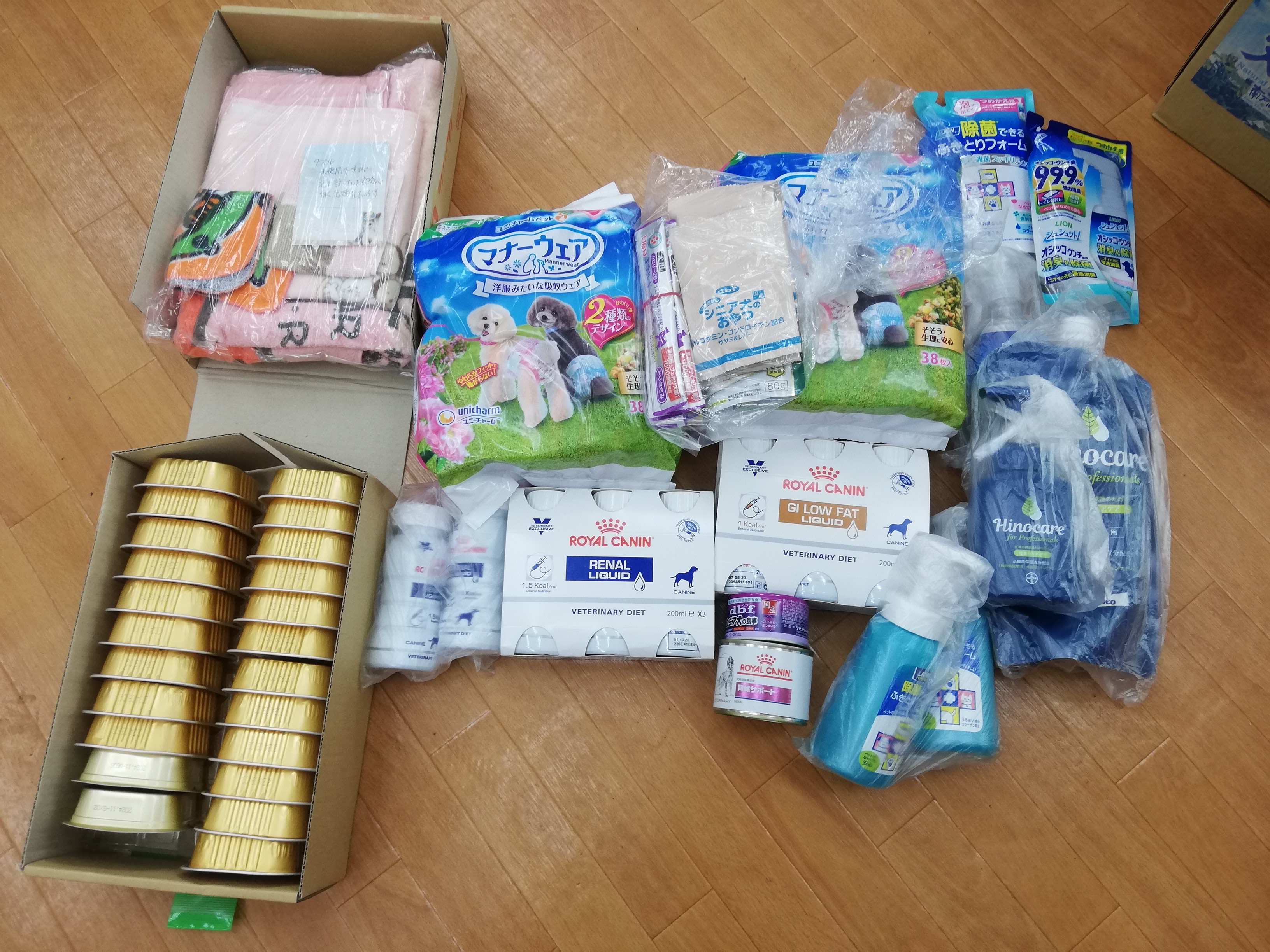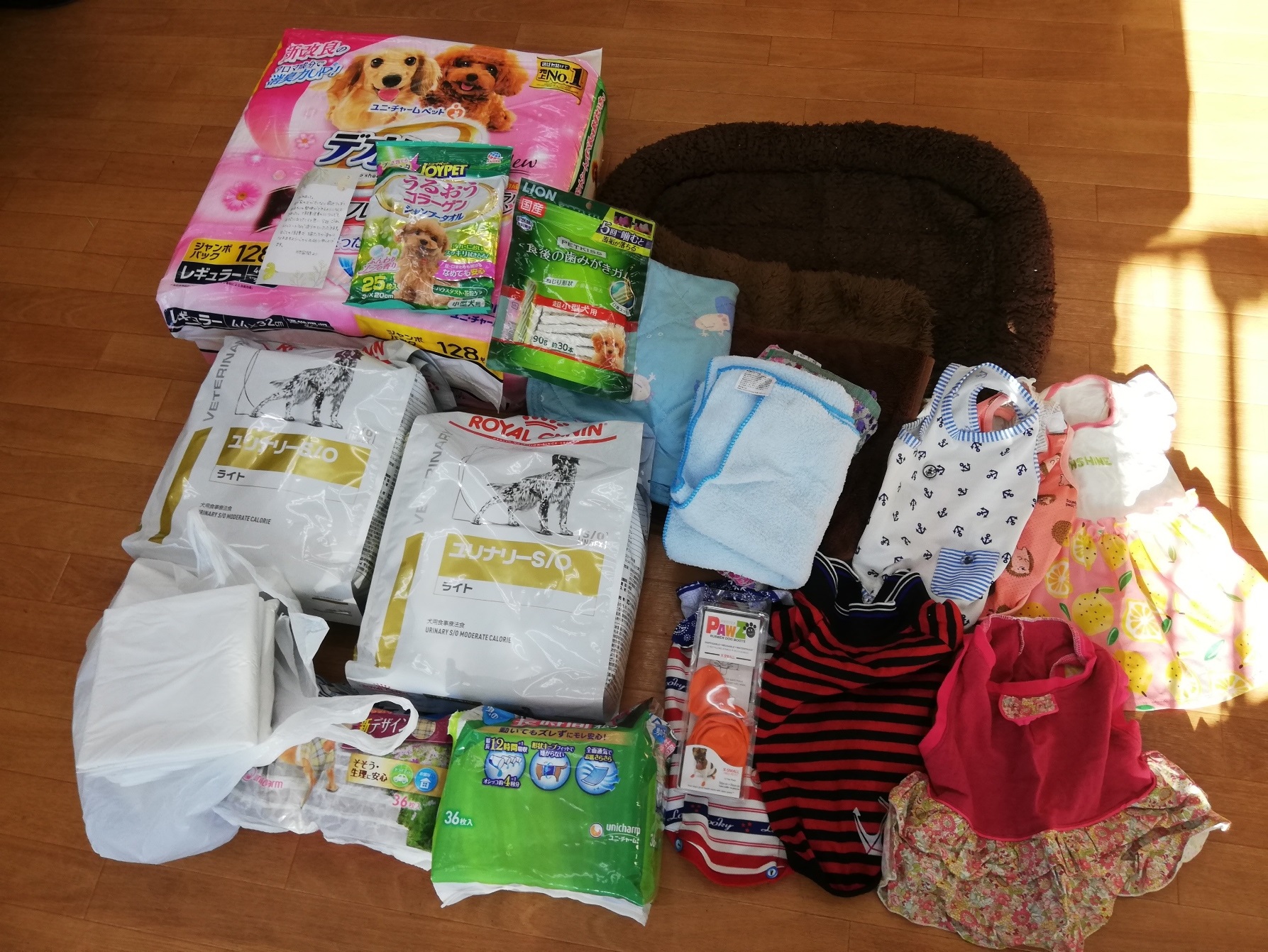 千葉市のtetsusuke様から、処方食、トイレシーツ、ベッド、ワンコ服などたくさんの物資のご支援をいただきました。