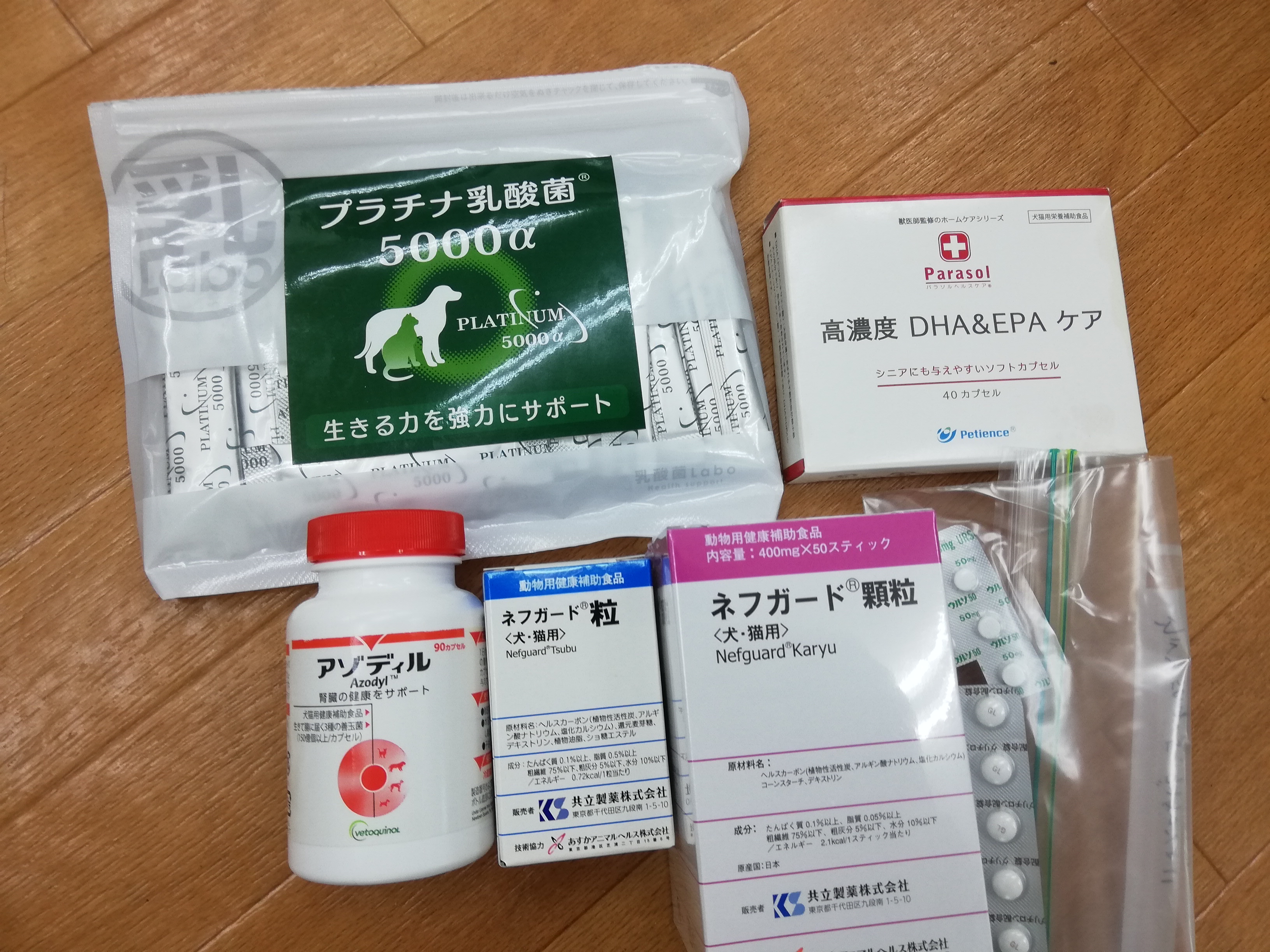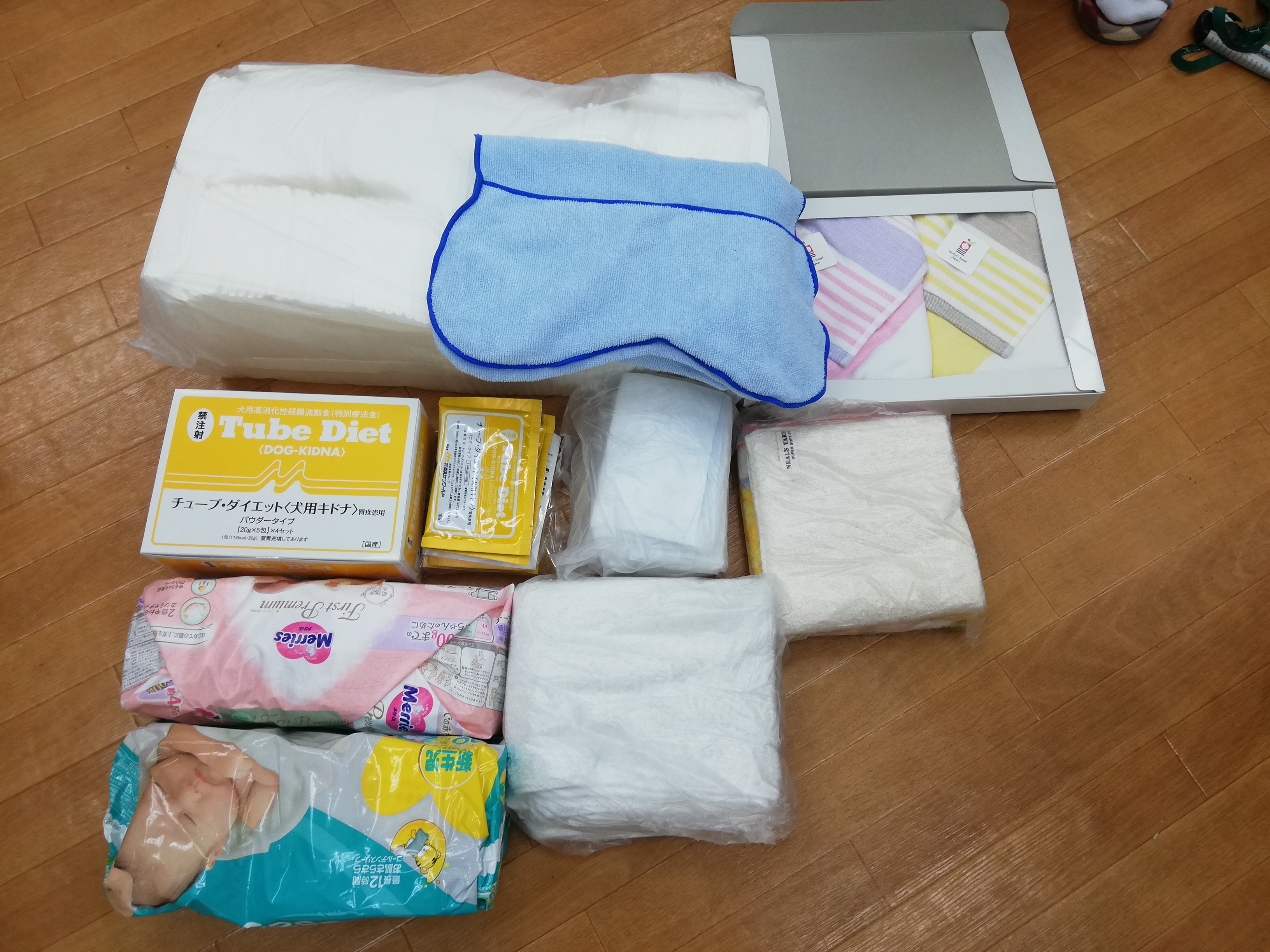 大田区のあずきママ様から、シーツやタオル、オムツなどとたくさんの腎臓の為のサプリメント類やアゾディル、キドナなどのご支援を頂きました。