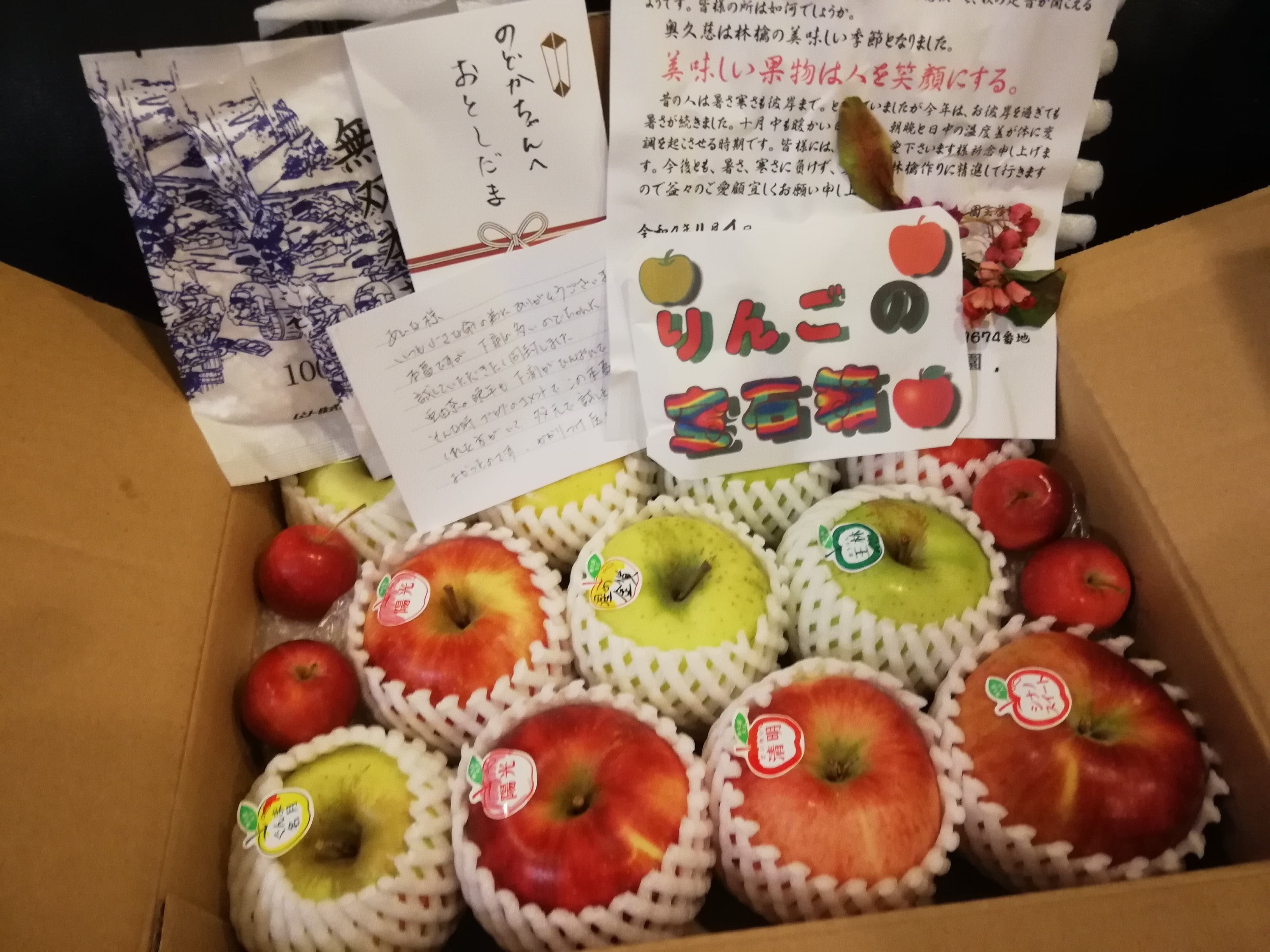 のどかのサポートママさんのyuko様から、のどかさんにりんごの宝石箱とのどちゃんのお腹にいい本くず粉とお年玉を頂きました。
