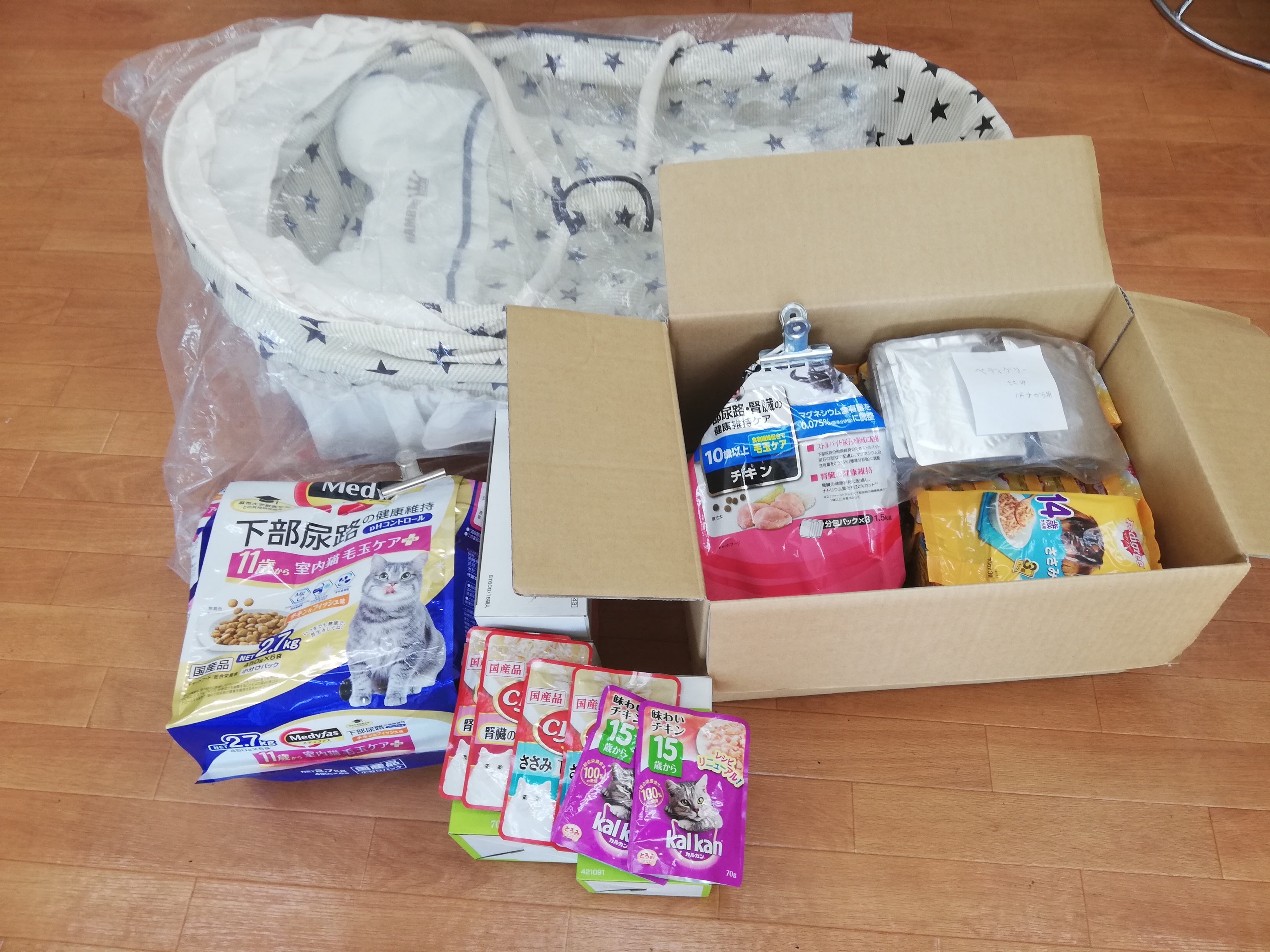 松戸市の山里様から、かわいいペットキャリーバッグ、フード、シーツ、ちゅーるやオムツ、など沢山のご支援を頂きました。