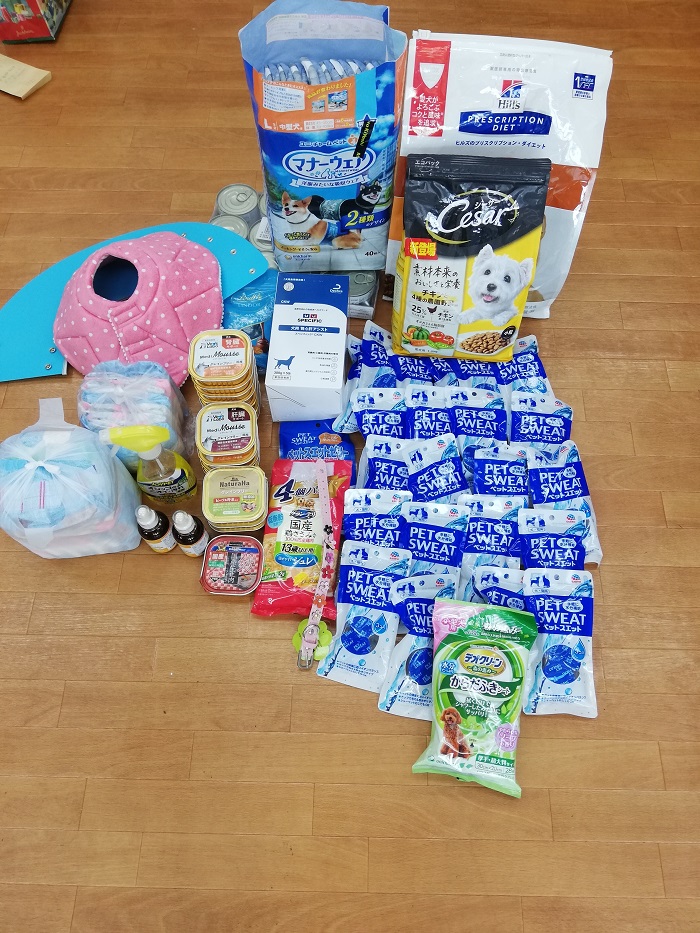 松戸市の一番君のママ様より、一番君の為にご用意されていた腎臓用フードやマナーウエア、ペットスウェットなどたくさん保護犬達へ、と頂きました。