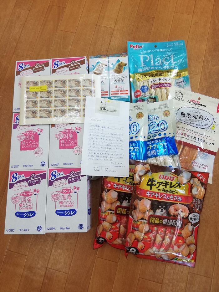 岡山県の岩佐様より、レトルトフード、おやつ、スポット駆除剤、切手などたくさんのご支援を頂きました。
