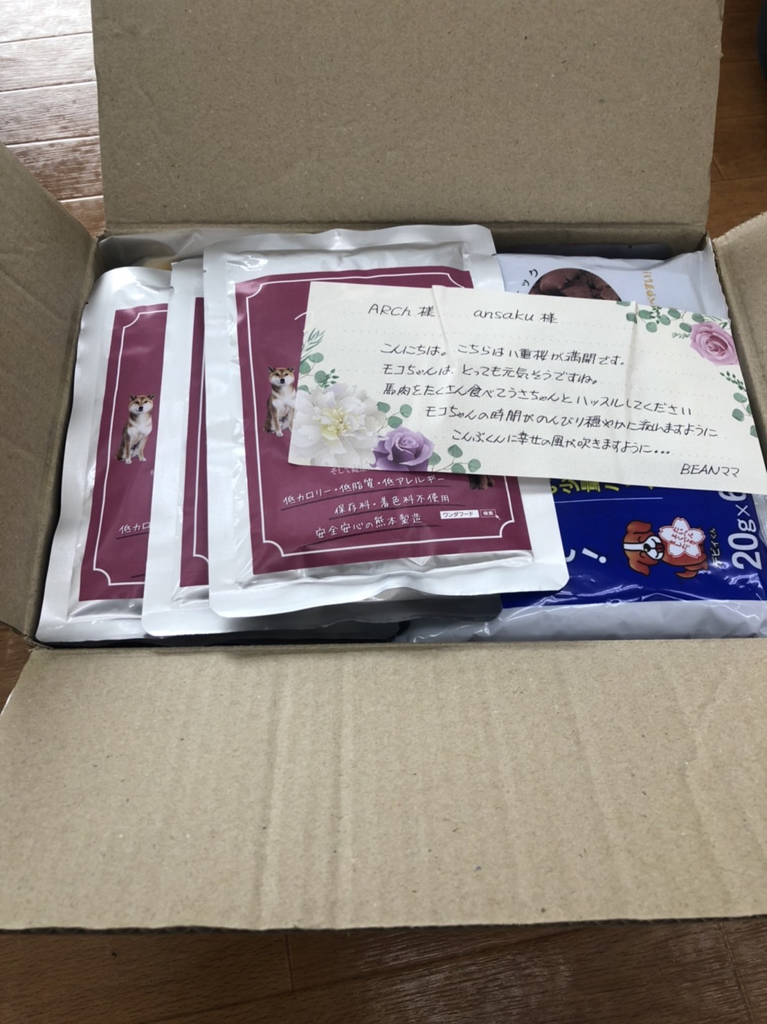 鎌倉市のBEANママ様より、ansakuさん預かりっこ達にモコちゃんの好きな馬肉のウマウマなどと、S★KG合宿所にまっくす君の食べられる低脂肪のおやつや合宿所必需品の消耗品などを頂きました。