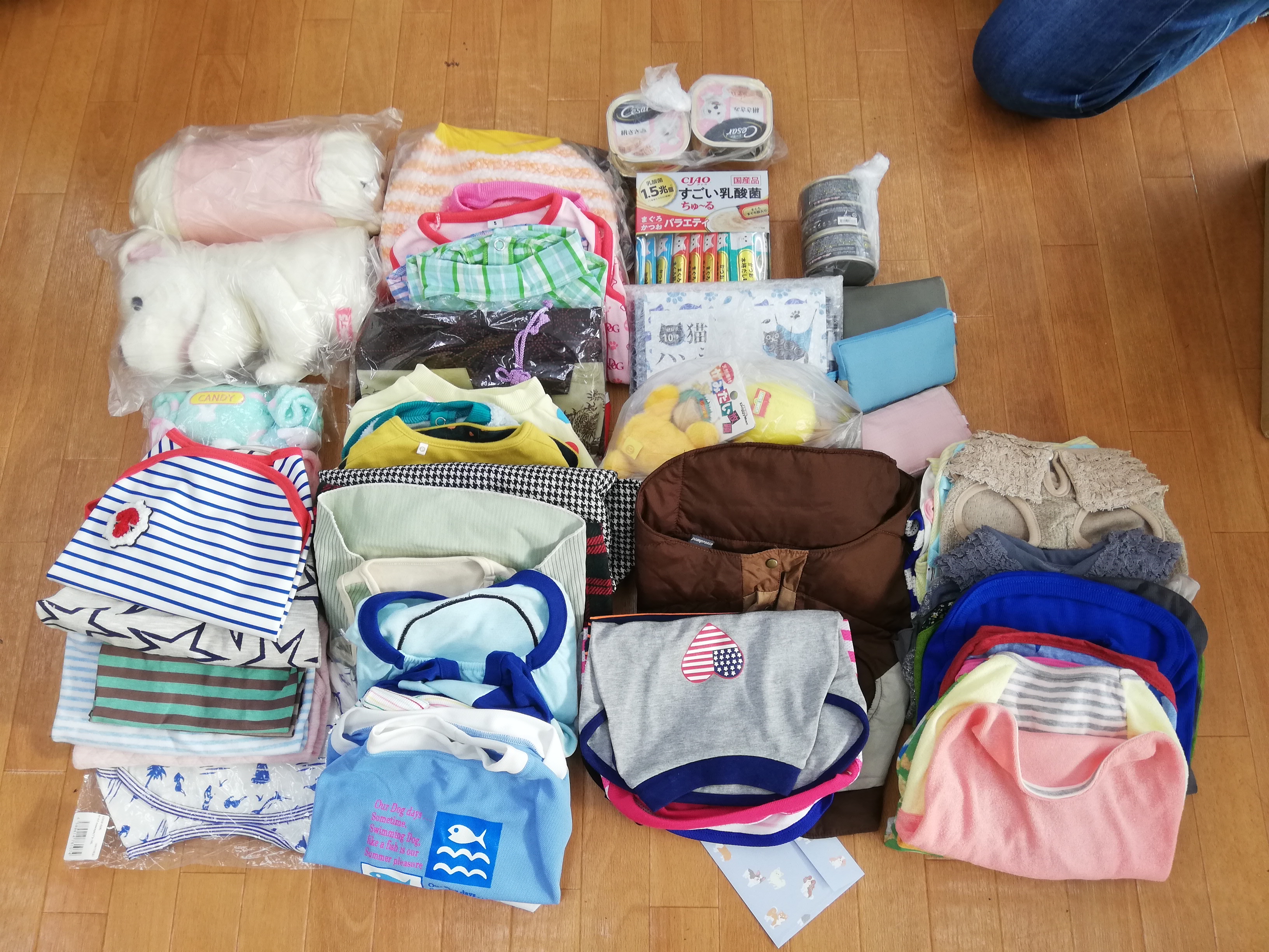 横浜市の加賀美様より、たくさんのワンコ服やおもちゃなどのワンコグッズやフードのご支援を頂きました。