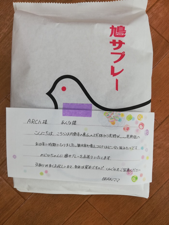 サポートファミリーになったくださった鎌倉市のBEANママ様より、食欲のムラのあるのどかさんに、のどかさんの好きなレバーの缶詰やおやつ、好物の鳩サブレーを頂きました。