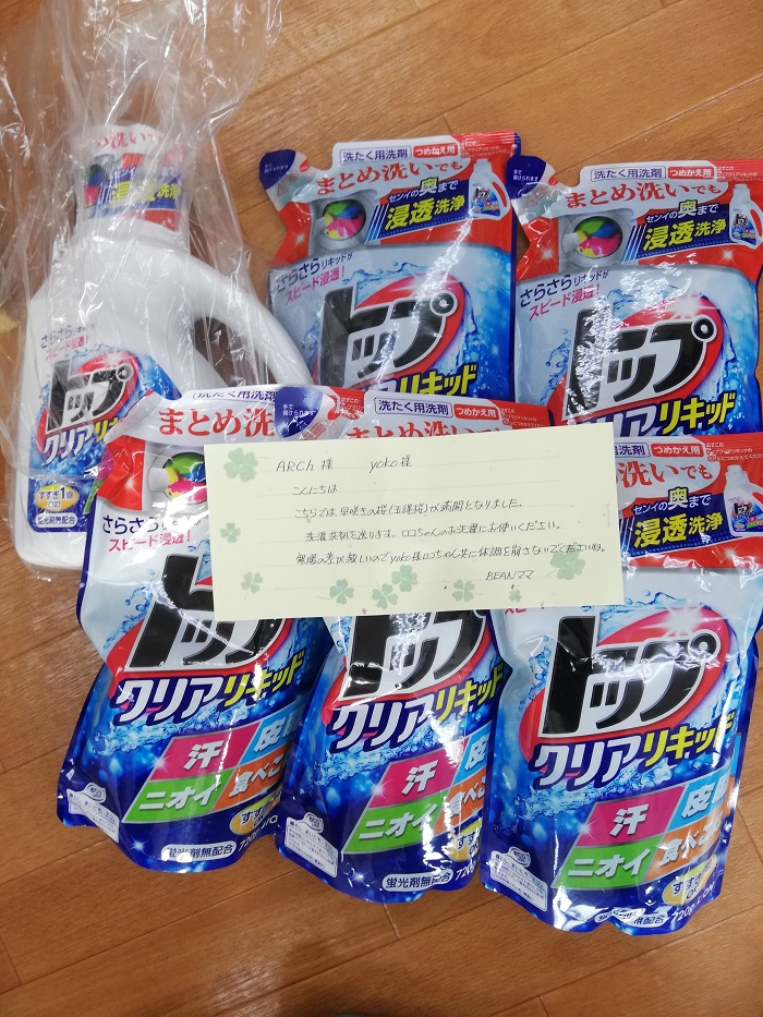 ロコぴのサポートファミリーのBRANママ様より、ロコぴ預かり家庭に洗剤のご支援を頂きました。およだでお洗濯多いロコぴのお世話に使わせて頂きます。yokoさんお洗濯がんばれ~^^