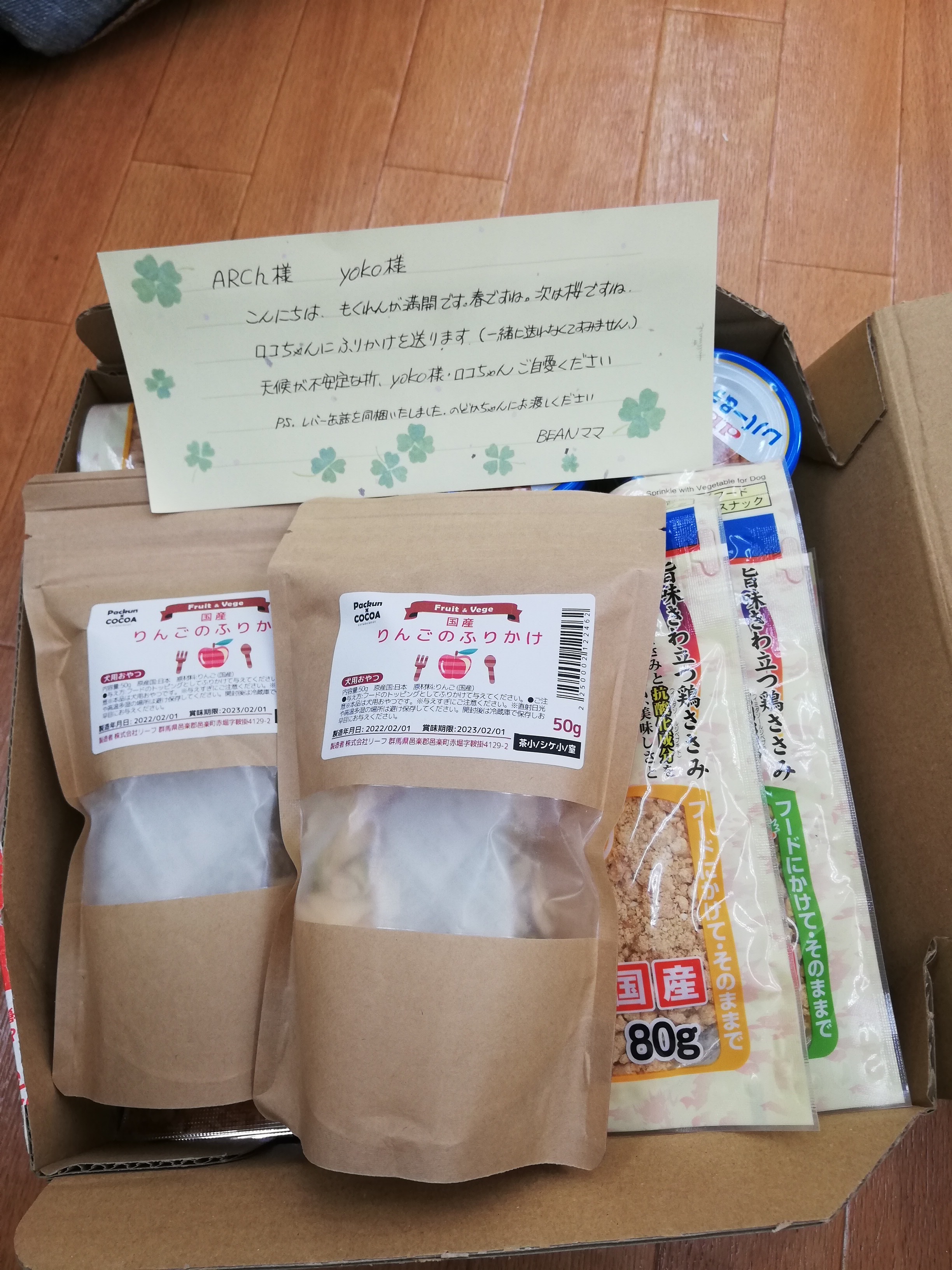 サポートファミリーでもある鎌倉市のBEANママ様から、ロコぴへのたくさんのふりかけと、のどかさんへレバーの缶詰を頂きました。