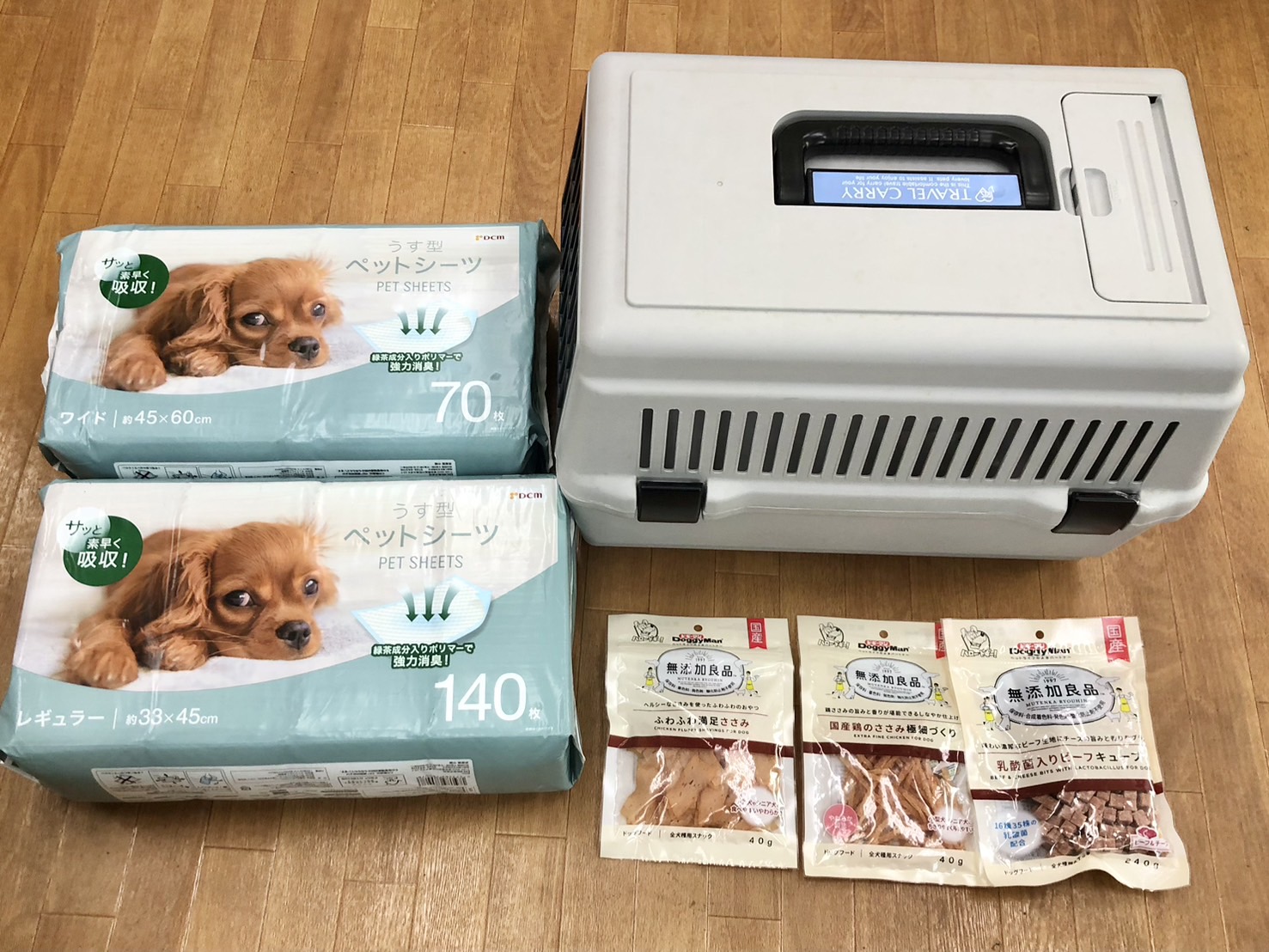 キャリーケース、おやつ、シートのお支援をいただきました。