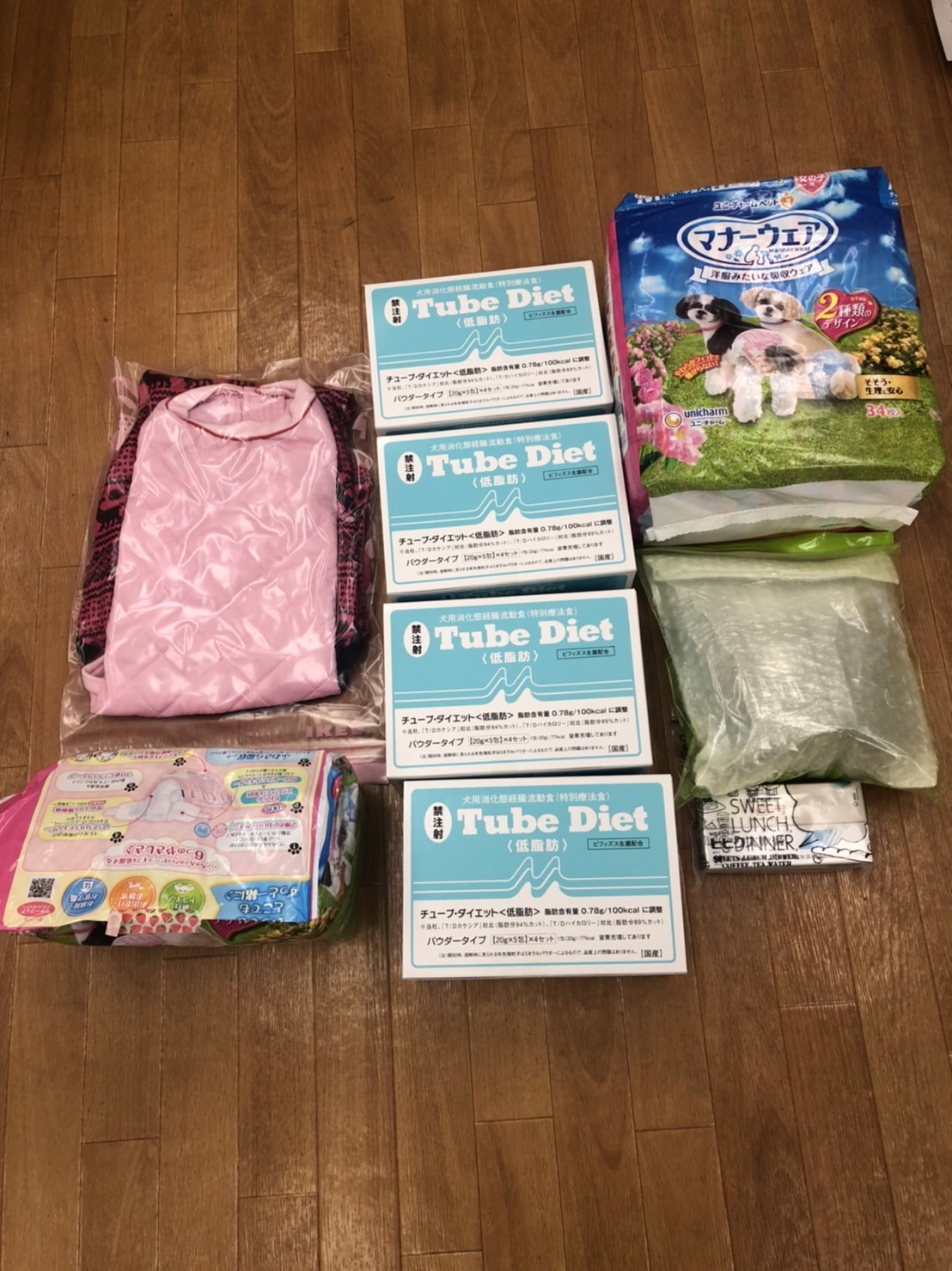習志野市の清水様より、チューブダイエット、ワンコ服、介護ハーネスやワンコ服、オムツなどのご支援を頂きました。保護犬達で大切に活用させて頂きます。