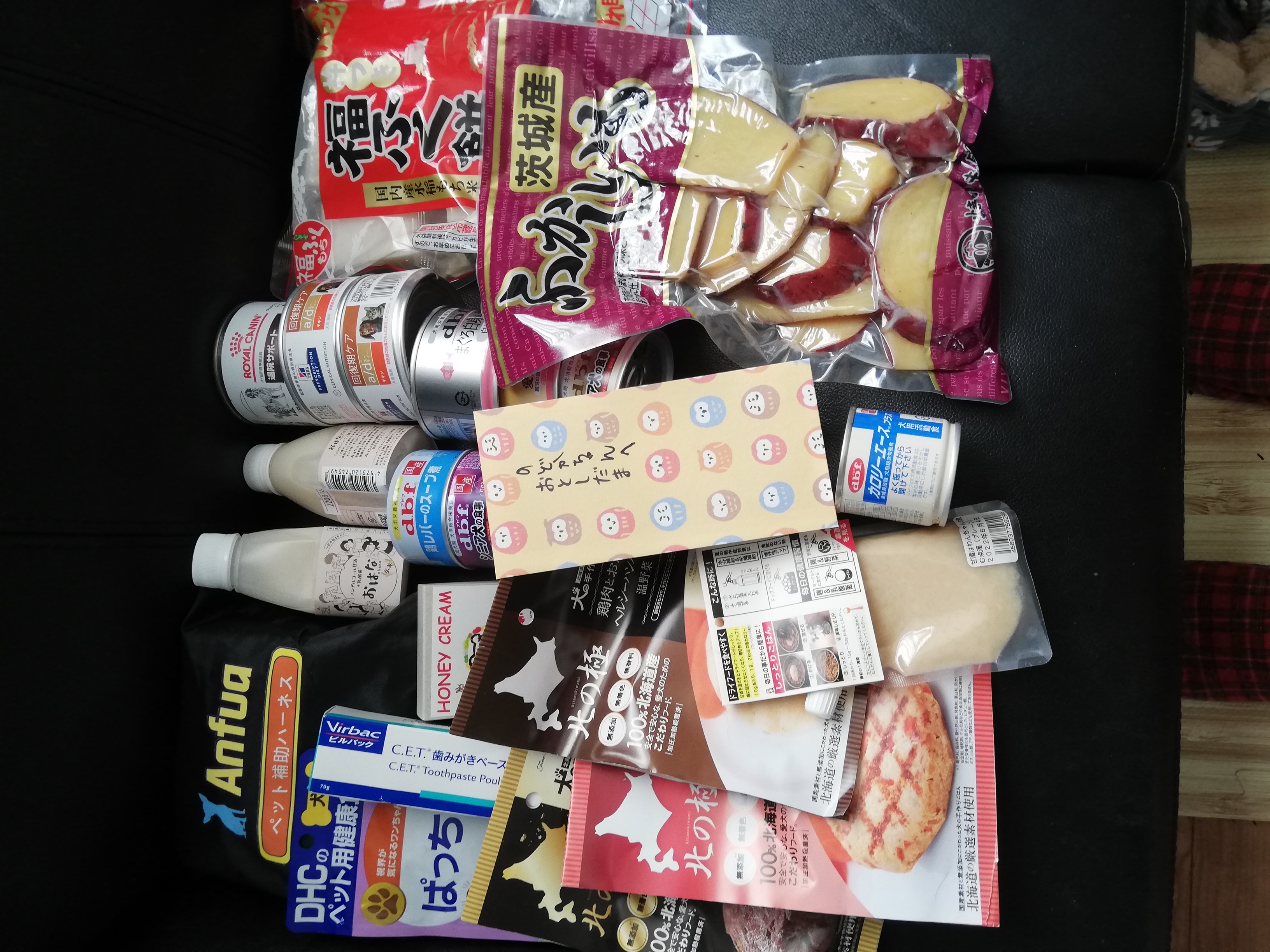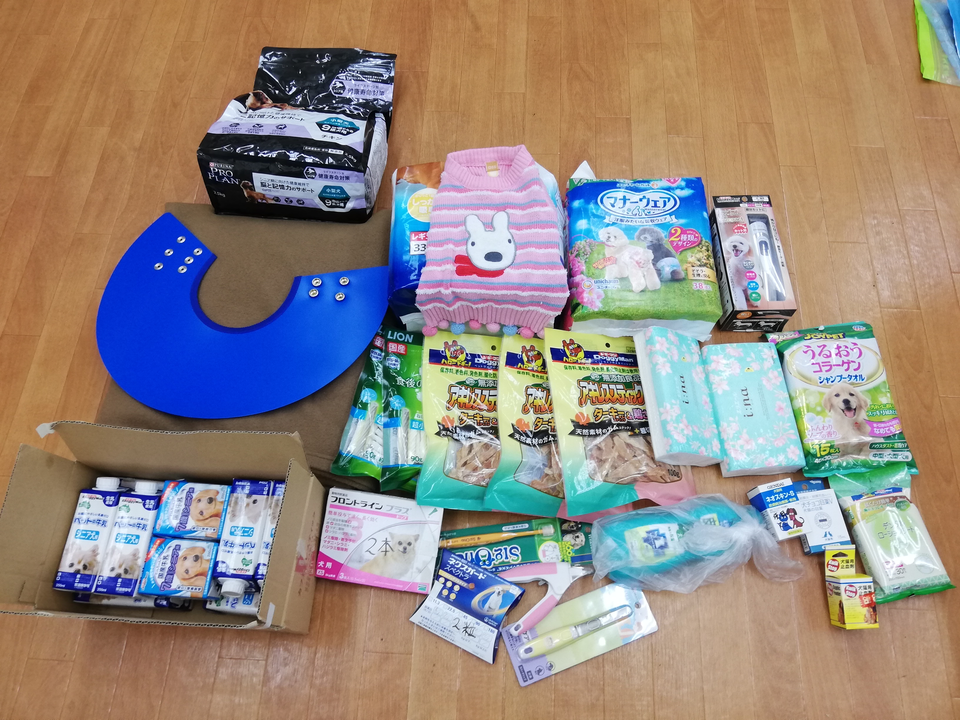 佐倉市のくうちゃんのおばば様から、愛犬くうちゃんの為にご用意されていたワンコ用牛乳やフードやおやつ、ケア用品などたくさんのお品を頂きました。