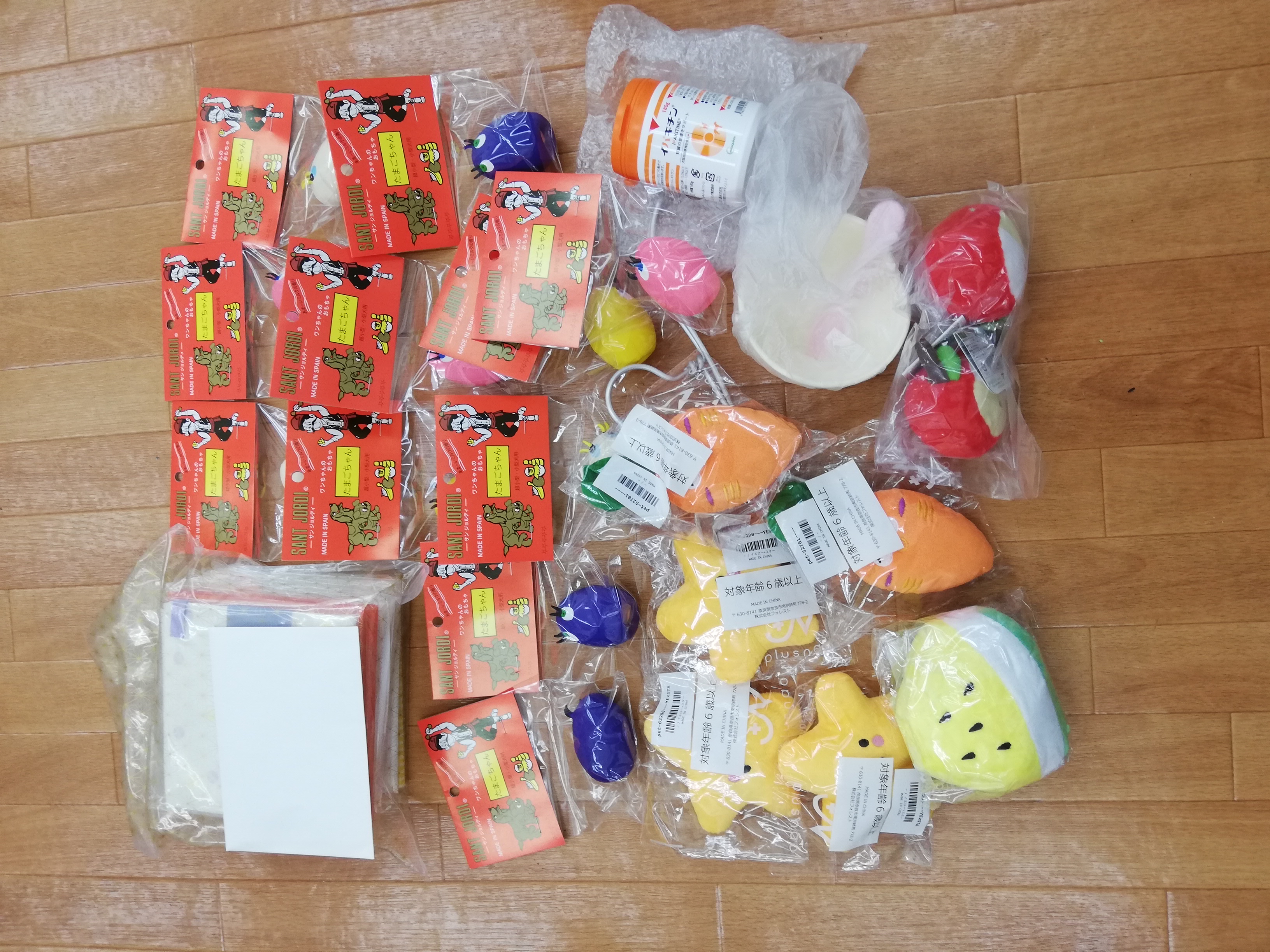 三浦市のうちだ様より沢山のたまごちゃんなどのおもちゃ、イバキチン、食器、きれいな布巾などを頂きました。みんなが好きなたまごっちやおもちゃ おもちゃ好きのワンコ達に配布させて頂きます。
