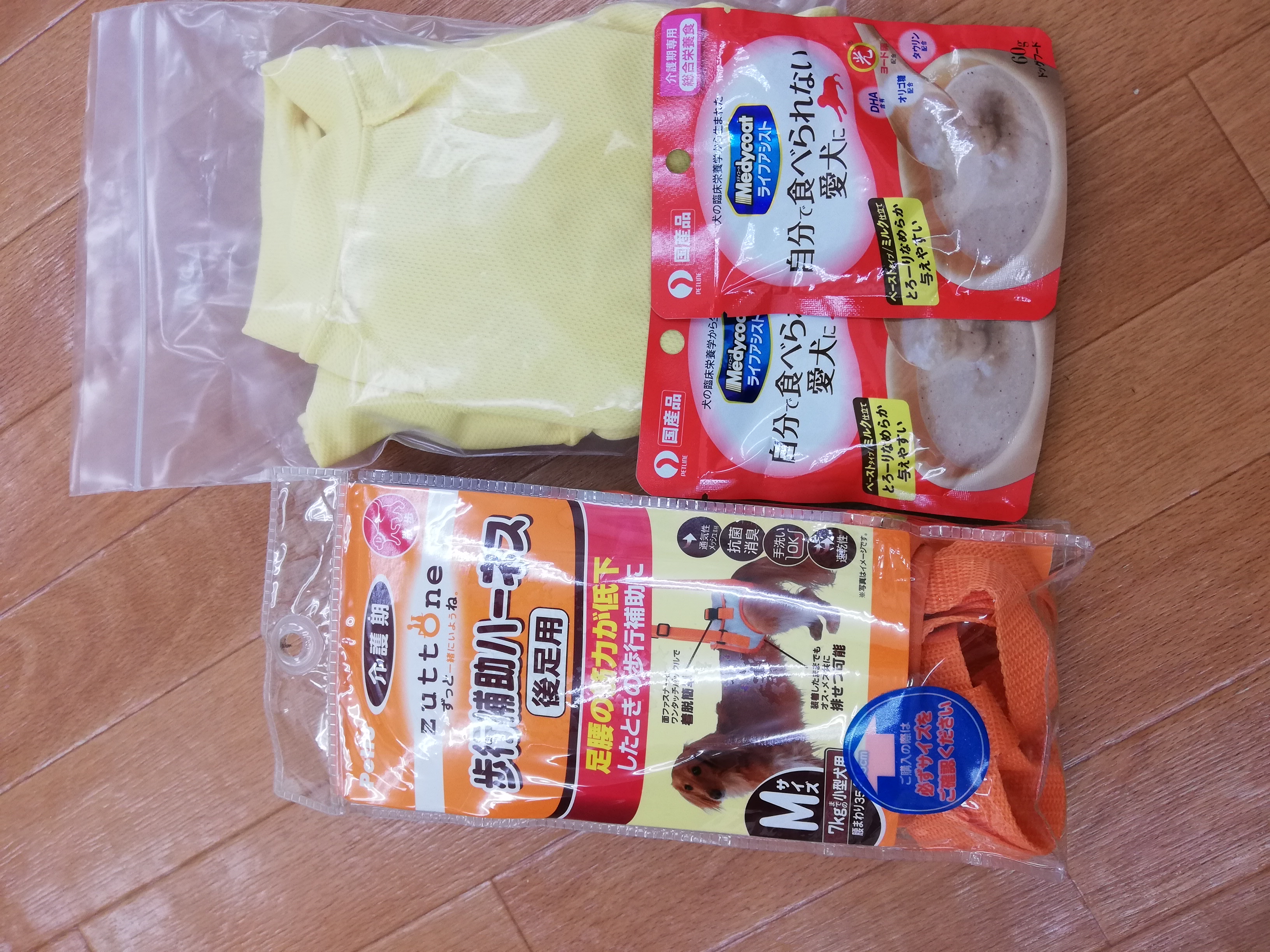 ヒューガ君のお見合いの際にH様より、先代ちゃんの為にご用意されていた介護服や介護ハーネス、介護食を頂きました。保護犬達の為に大切に活用させて頂きます。