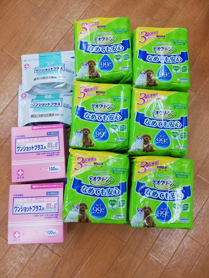 だい&メープル、さっちゃんママ様から、個包装おしぼりのご支援を頂きました。シニアワンコのケアなどにとても便利ですっきり気持ちよくさせてあげられます。