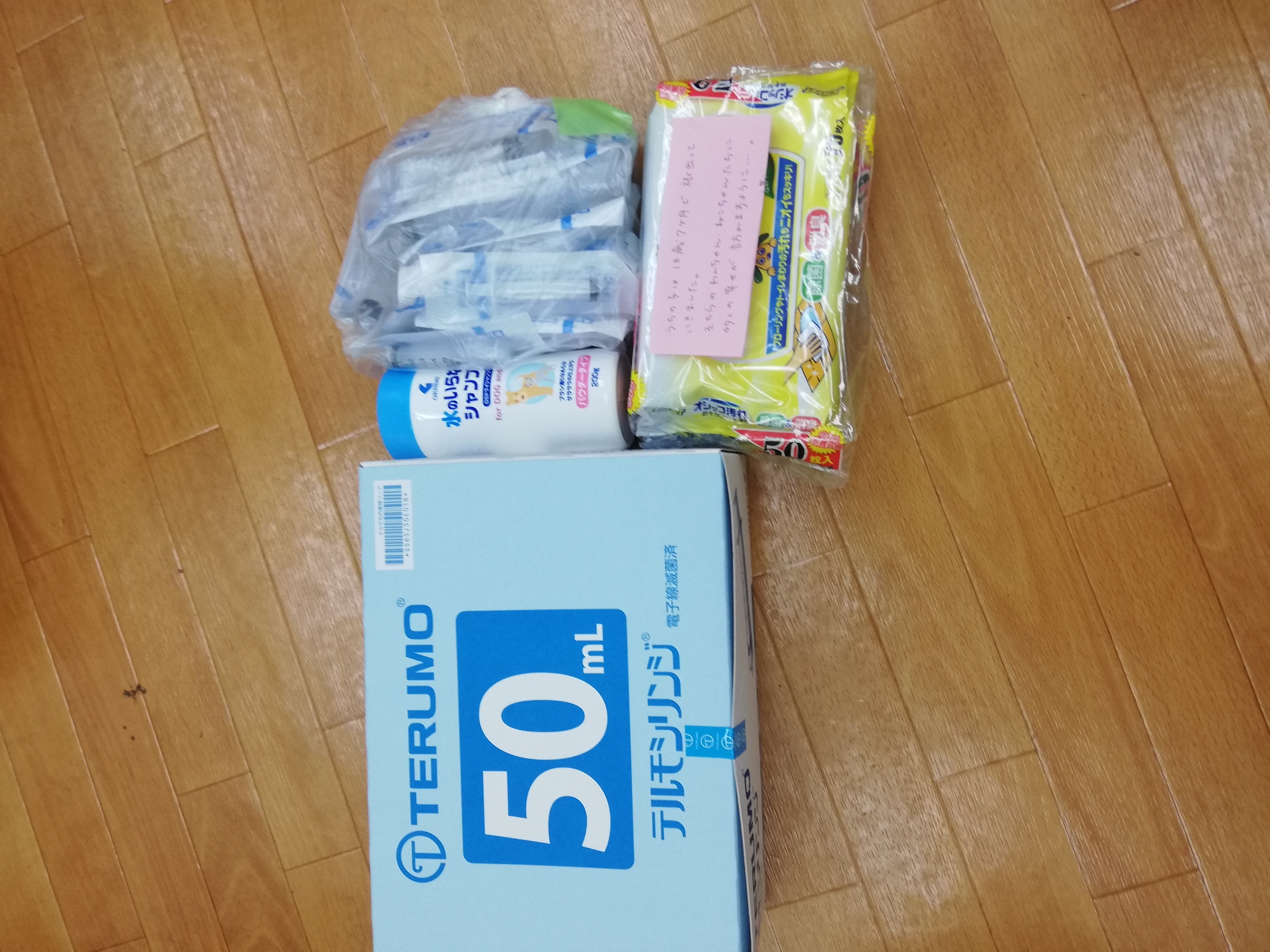 我孫子市のケン様より、シリンジ各サイズ、おしっこ汚れ拭きシートなどのご支援を頂きました。