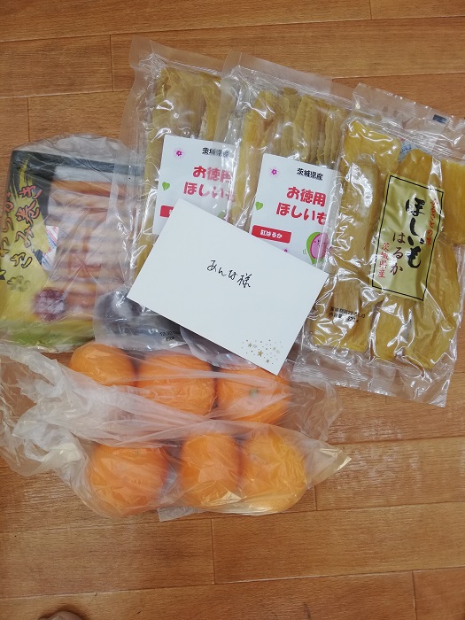 笠間市のyuko様から、のどかさんに美味しそうな干し芋やくだものを頂きました。