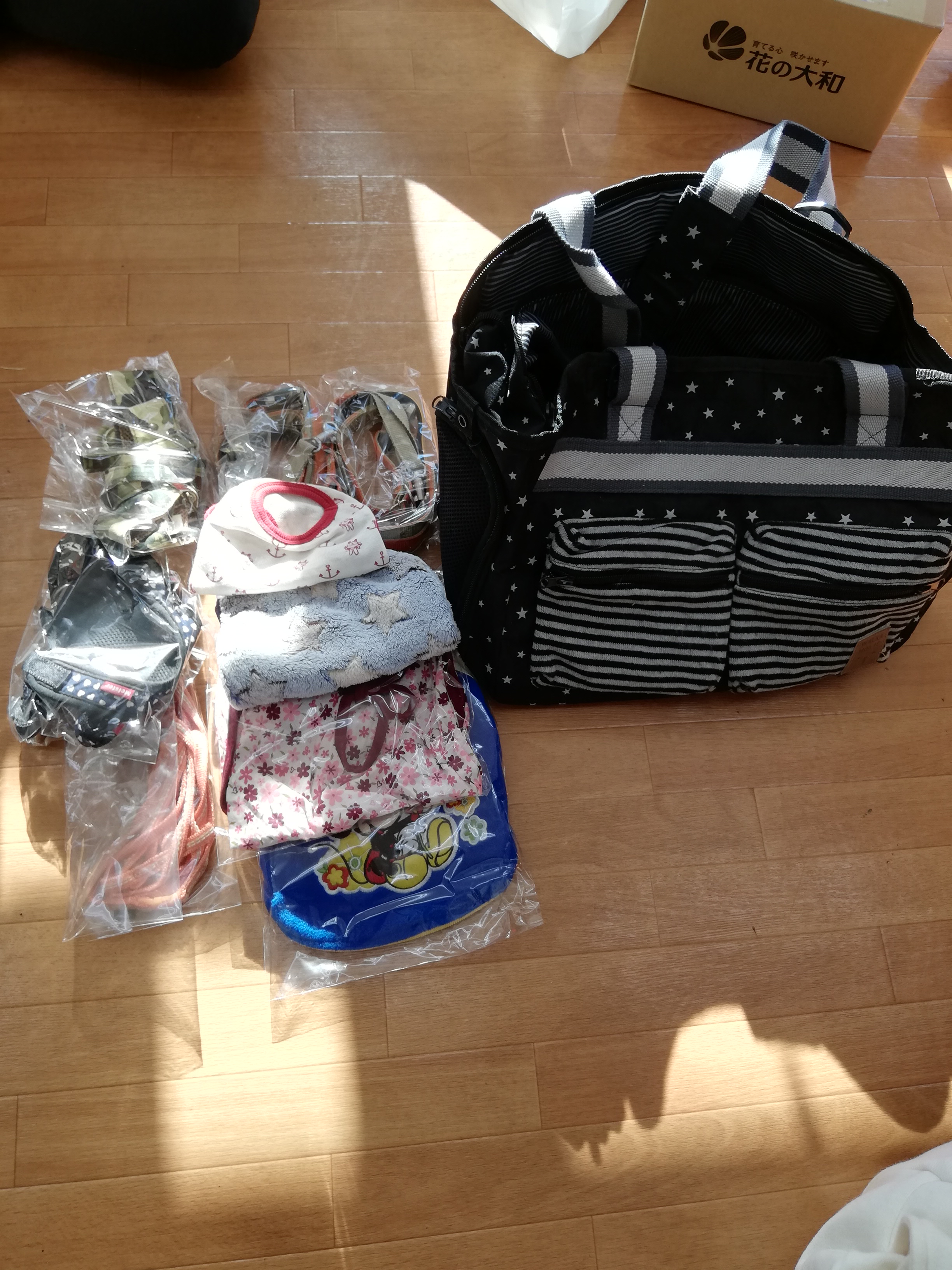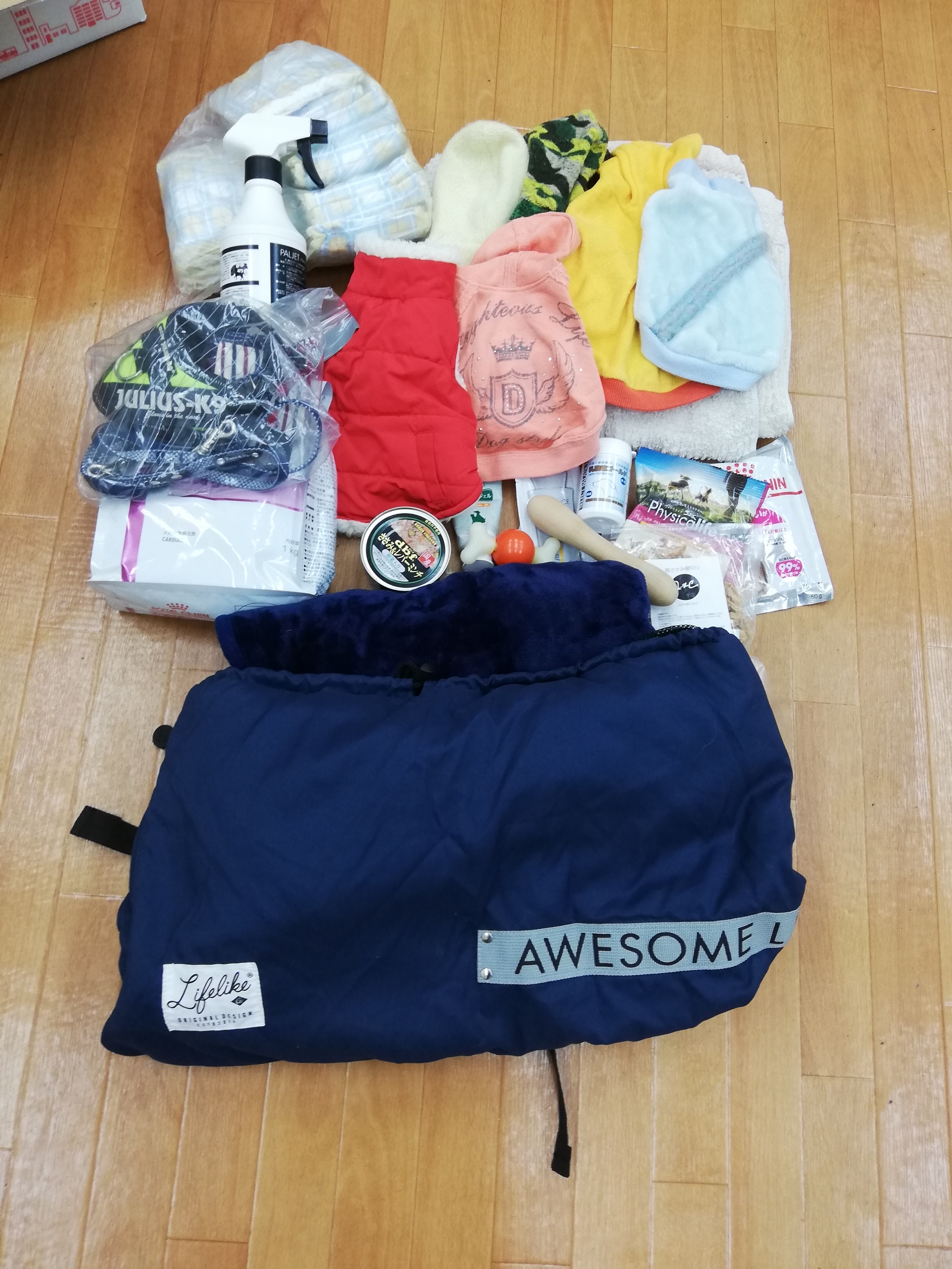 市川市のhana様より、キャリーバッグやハーネス・リードセット、首輪・リードセットやかわいいワンコ服などを頂きました。あたたかいお気持ちをありがとうございます。