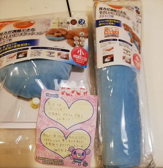 山武市の梅澤様より、介護用品、わんこおもちゃ、かわいいワンコ服などを頂きました。介護グッズはご指定のススムへと渡しました。温かいお気持ちをありがとうございます!! 大切に活用させて頂きます。