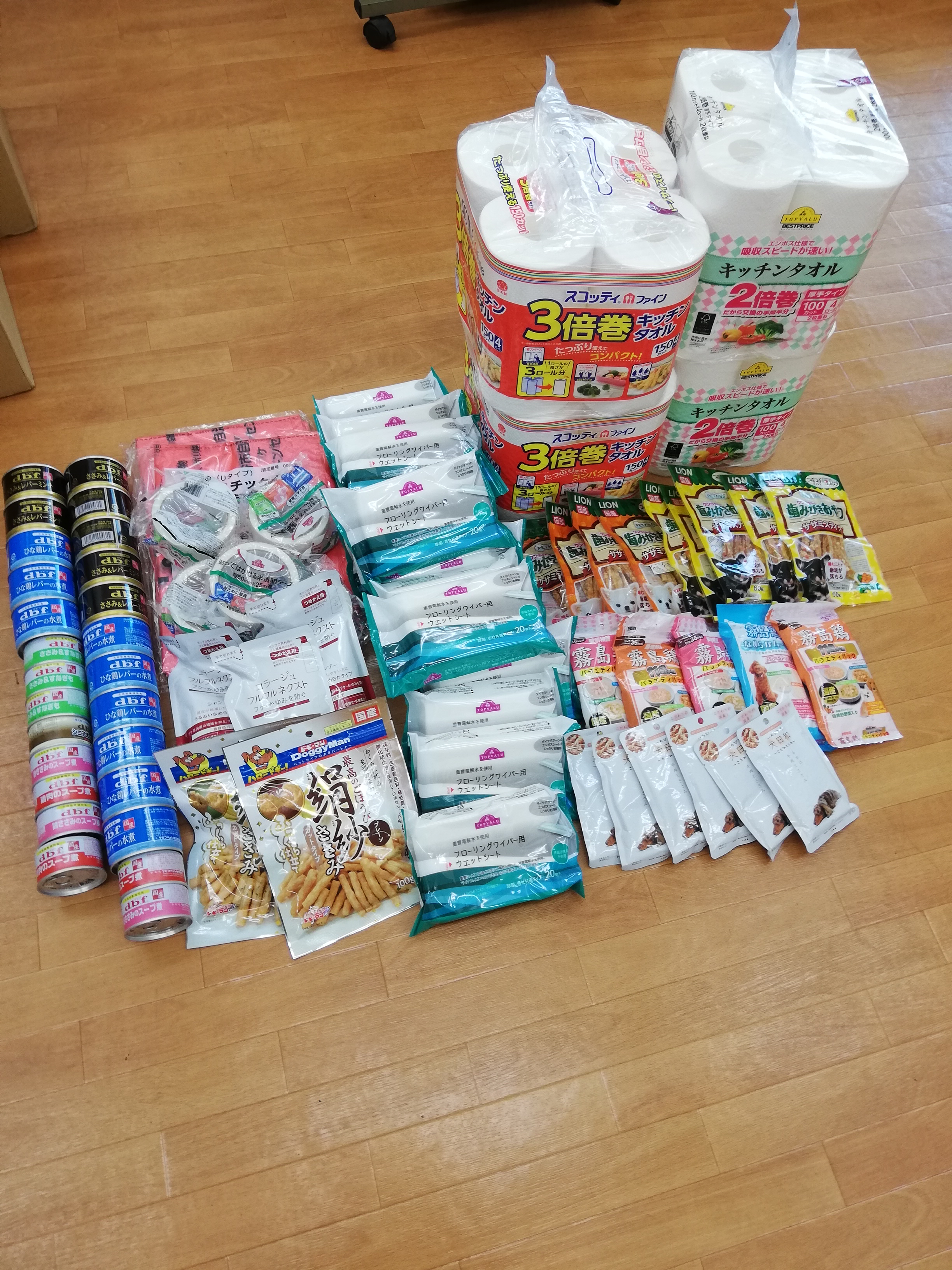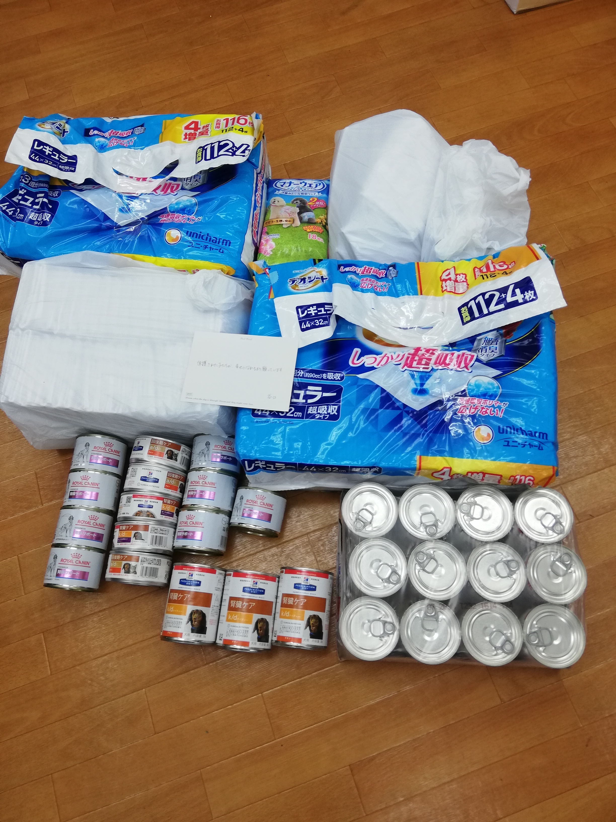 卒業生オリちゃん&レアちゃんのオリレアファミリー様から、処方食フードやおやつ、オムツなどたくさんのご支援を頂きました。低脂肪食指定の子も複数いますので低脂肪ボーロもとても喜んでおります。ありがとうございます!!
