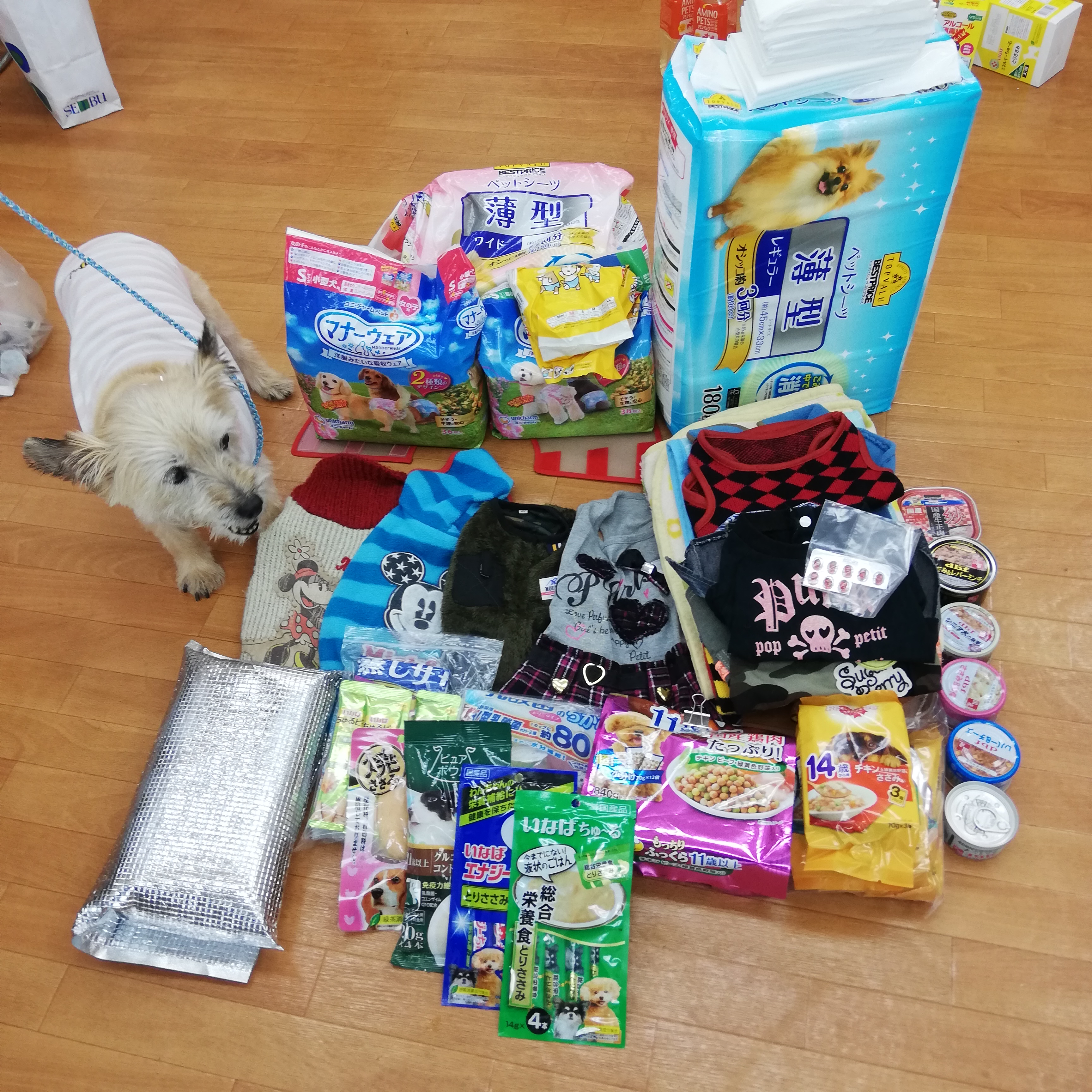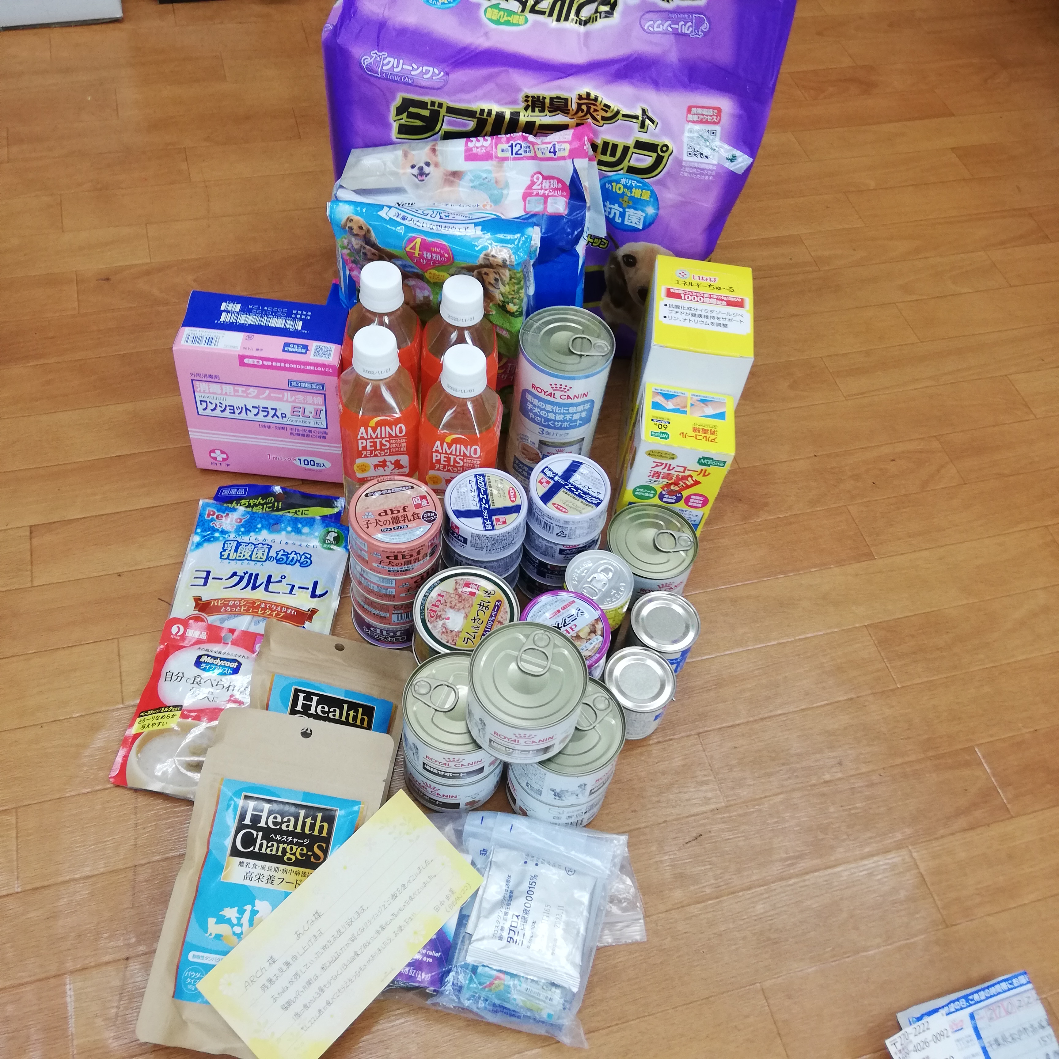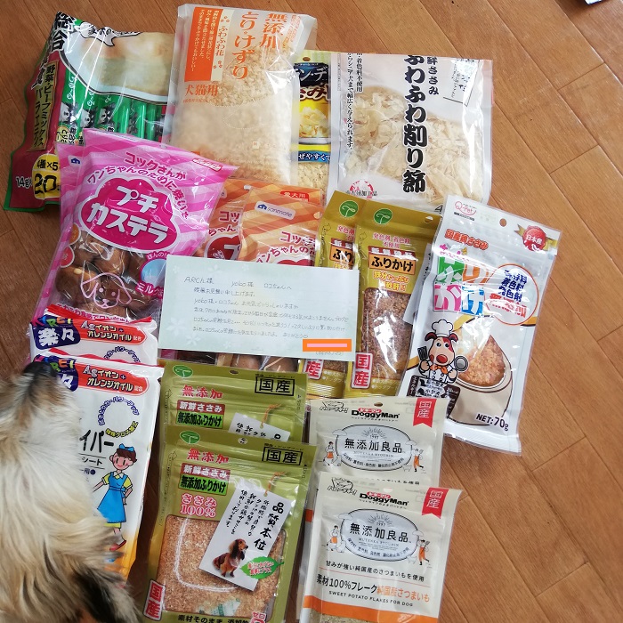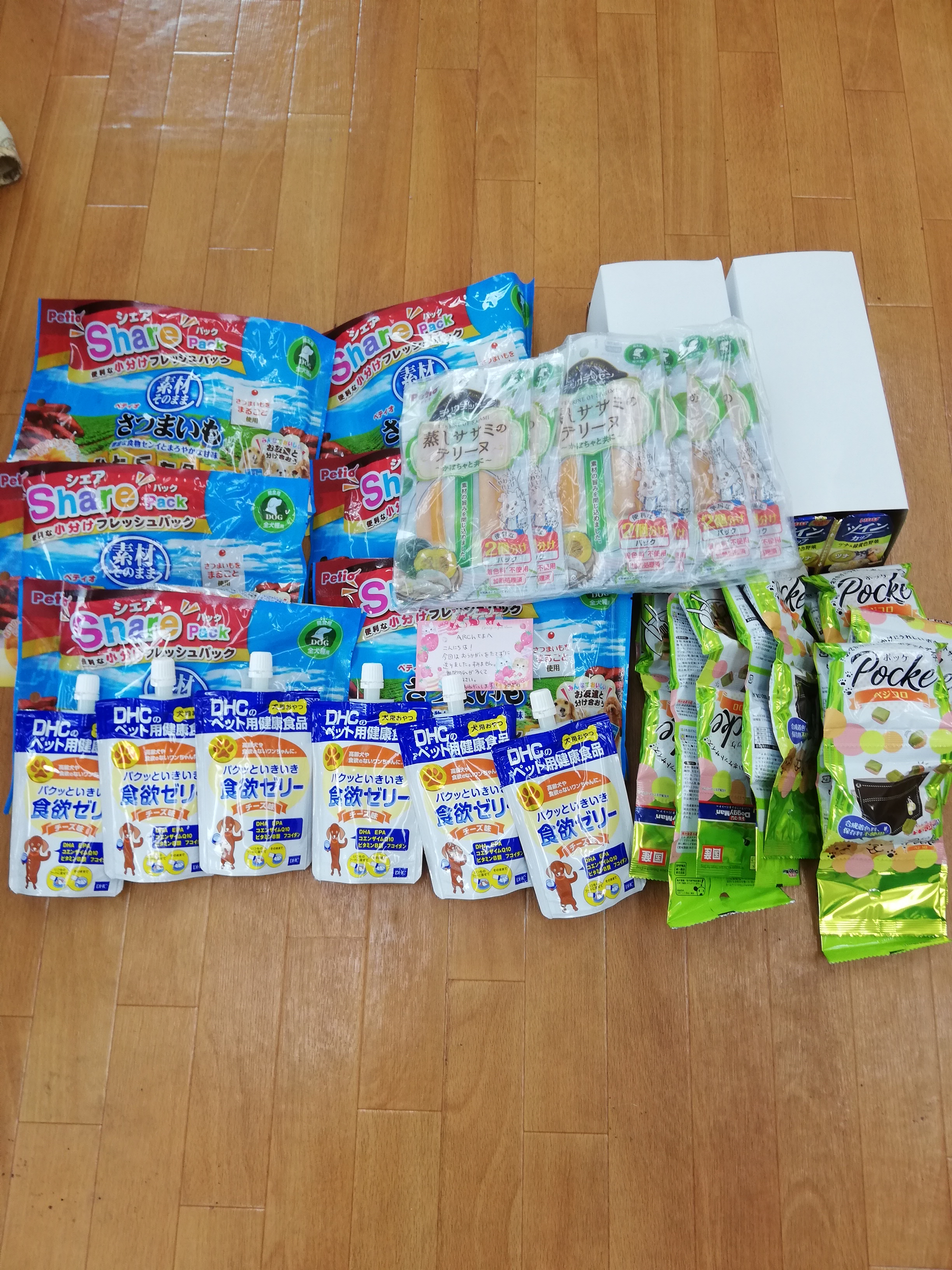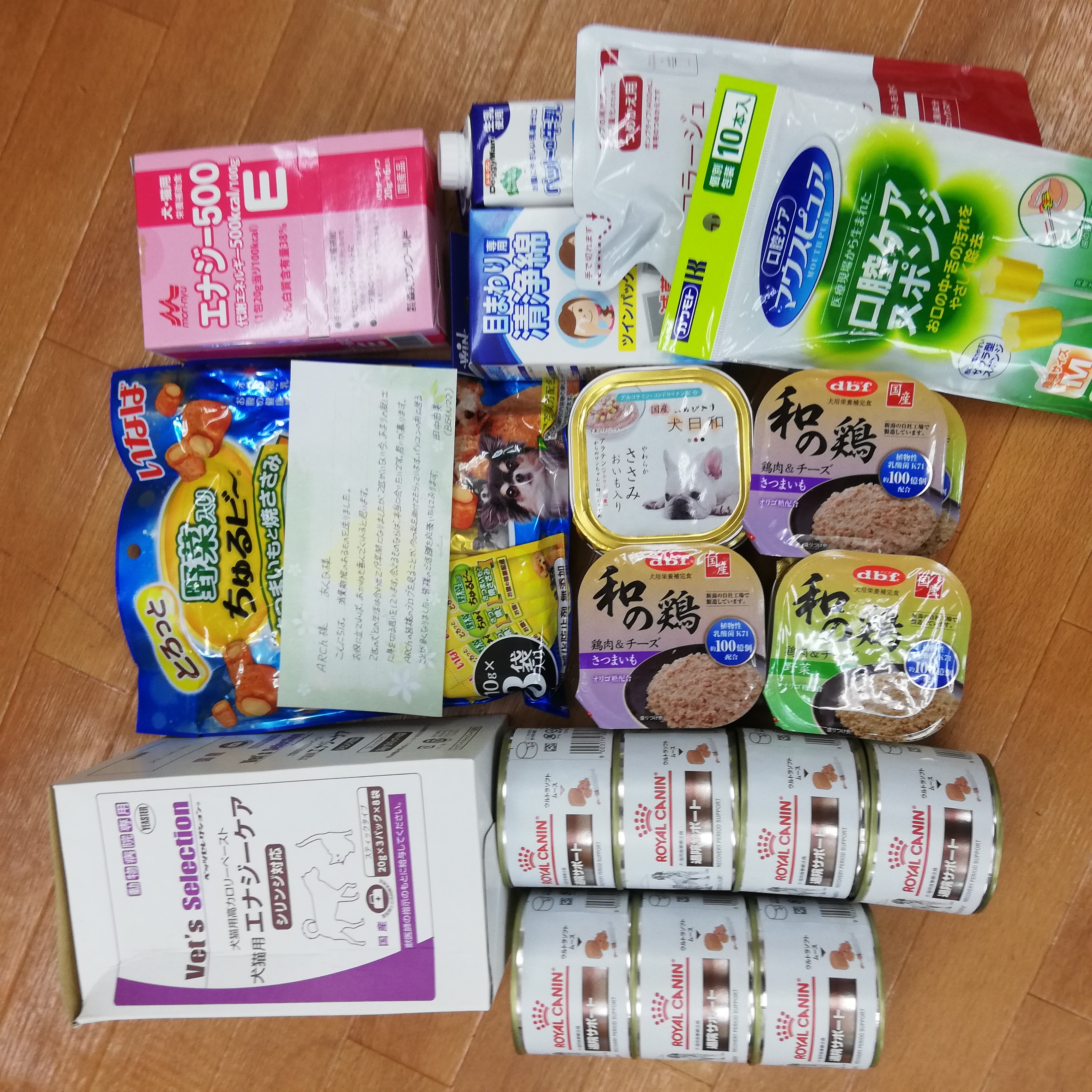 横須賀市のwakawaka様より、愛犬アーリーちゃんのためにご用意されていた たくさんのものをARChっこ達へと頂きました。病状急変で亡くなってしまったアーリーちゃんが食べられるものが変わって試行錯誤でいろいろと買いそろえられていたもの、とのこと。まだまだ、とのお気持ちがあふれていて胸が詰まる思い出受け取らせていただきました。