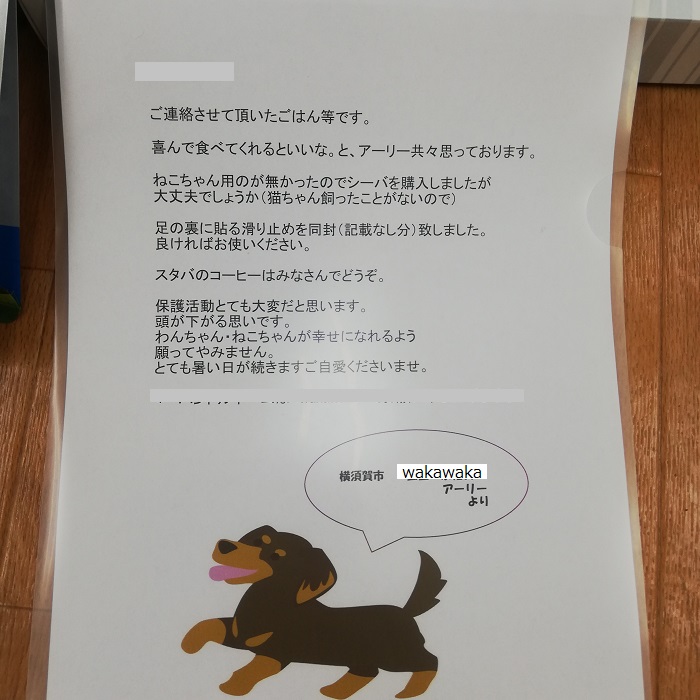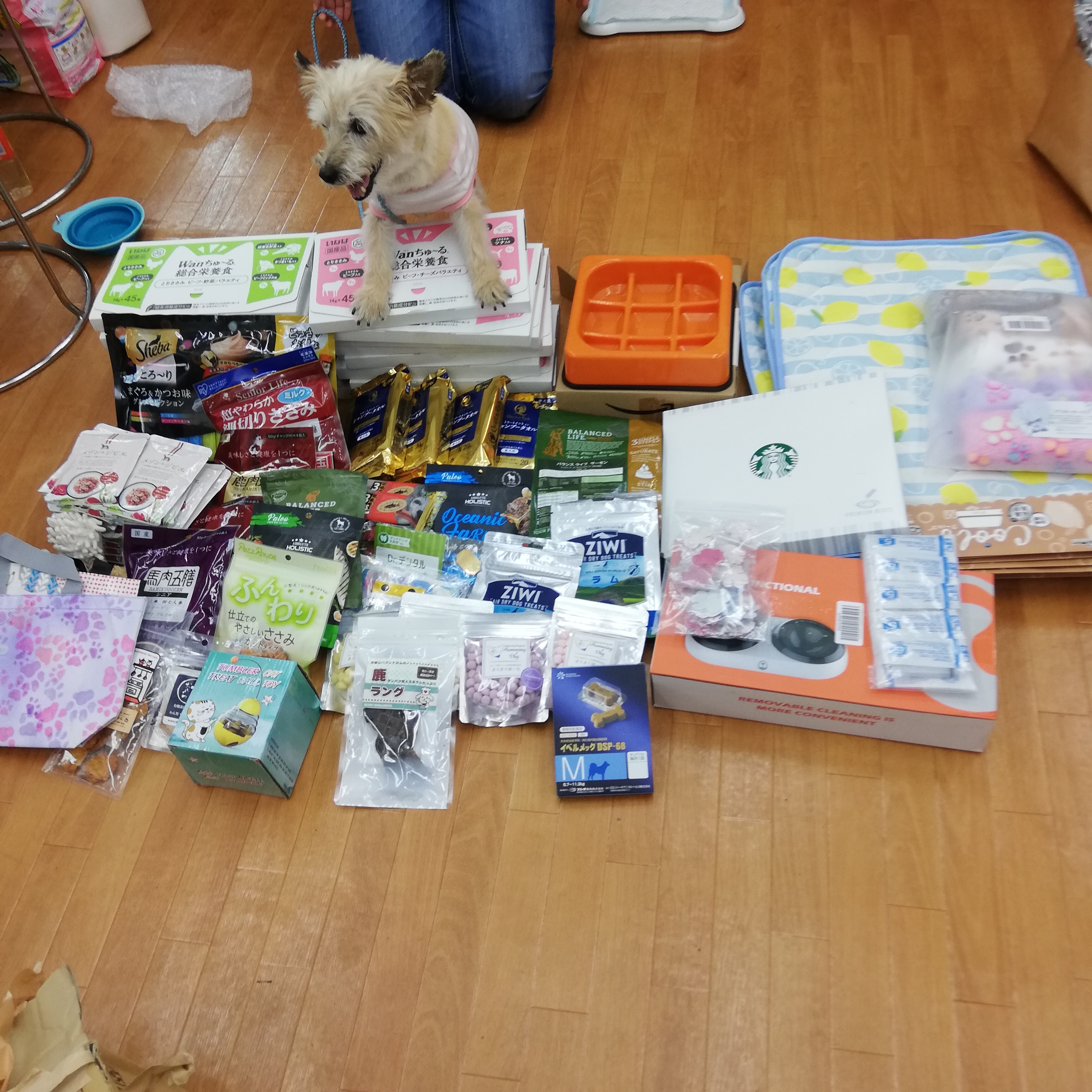 たくさんのマットやちゅーるもありがとうございます!居合わせたキャンディも次々で出てくるおやつなどに大喜びしておりました。保護犬達に大切に配布させていただきます。スタッフへのコーヒーもありがとうございます。