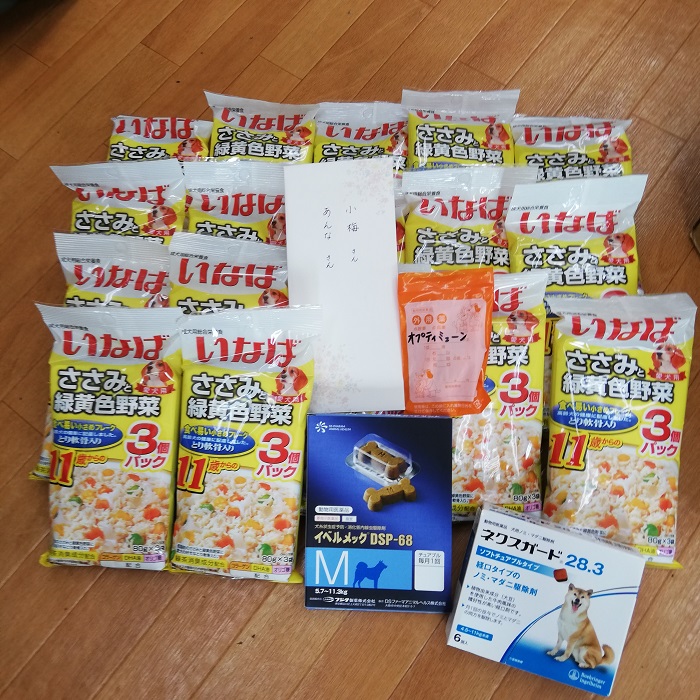 わこちゃん里親、茅ケ崎の丸山様より、わこちゃんにご用意されていたネクスガートやオプティミューン、フードなどをご支援頂きました。