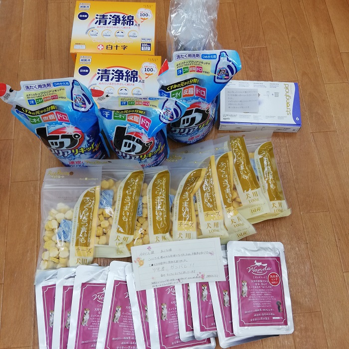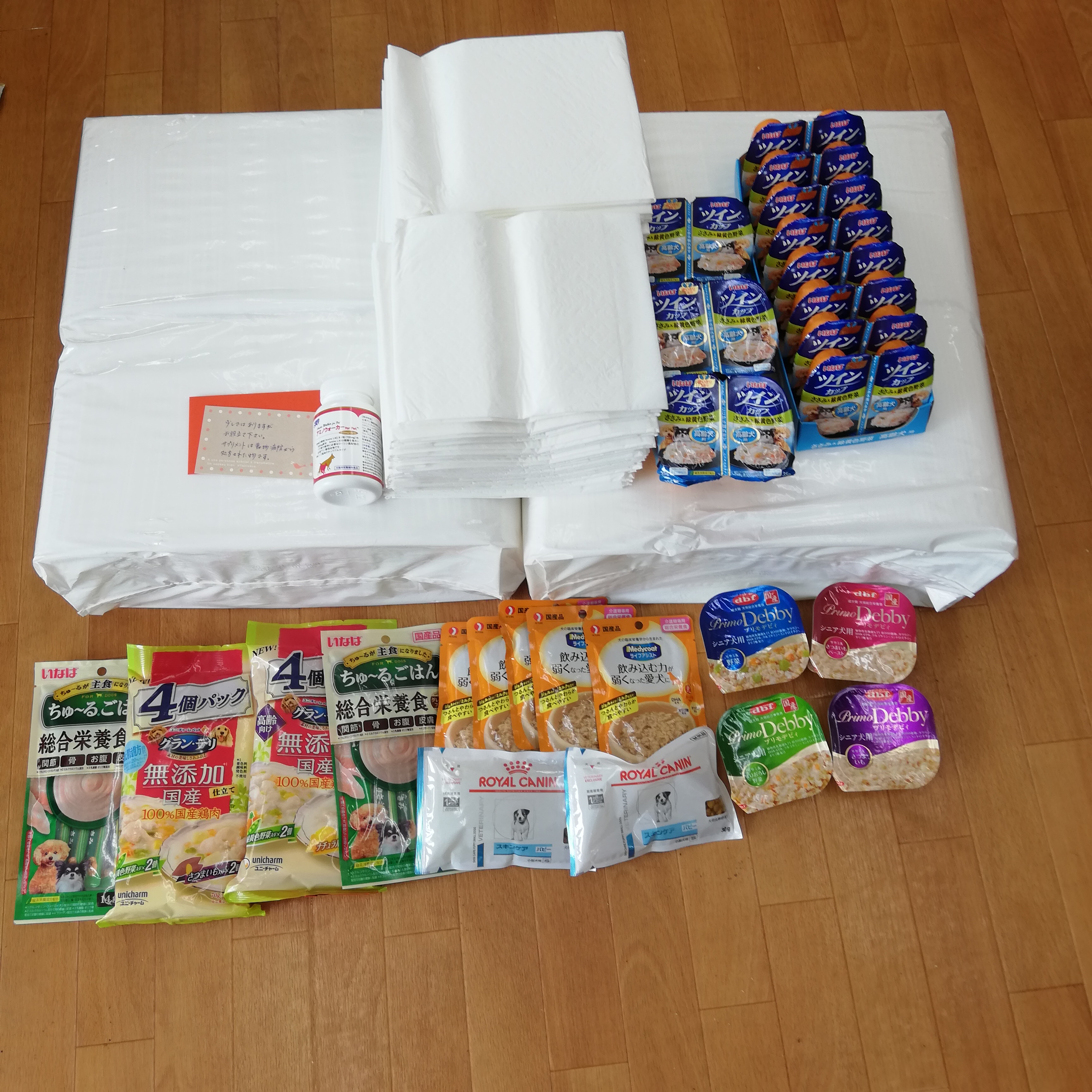 いすみ市の露崎様より、ペットシーツや高齢犬用のフードを頂きました。