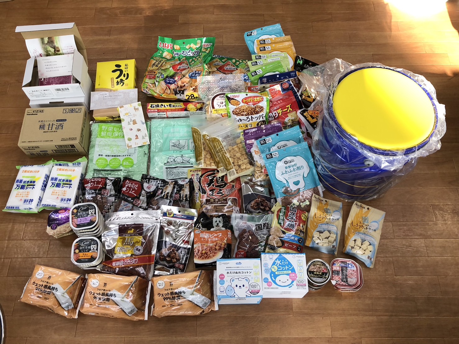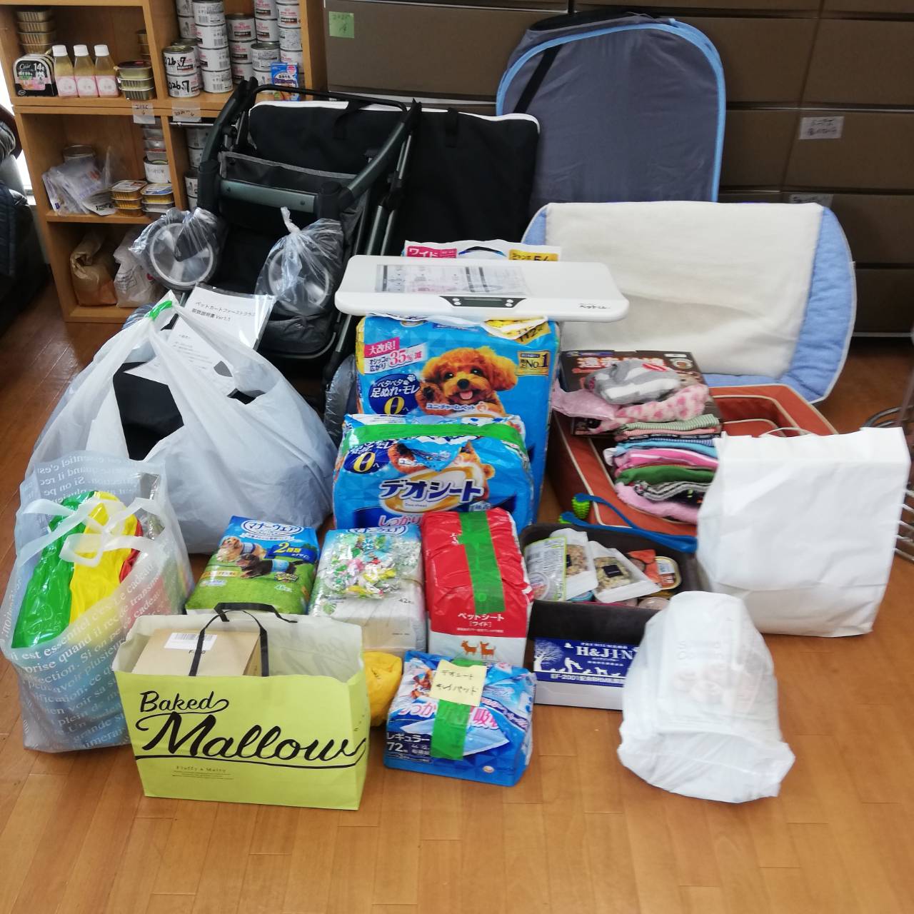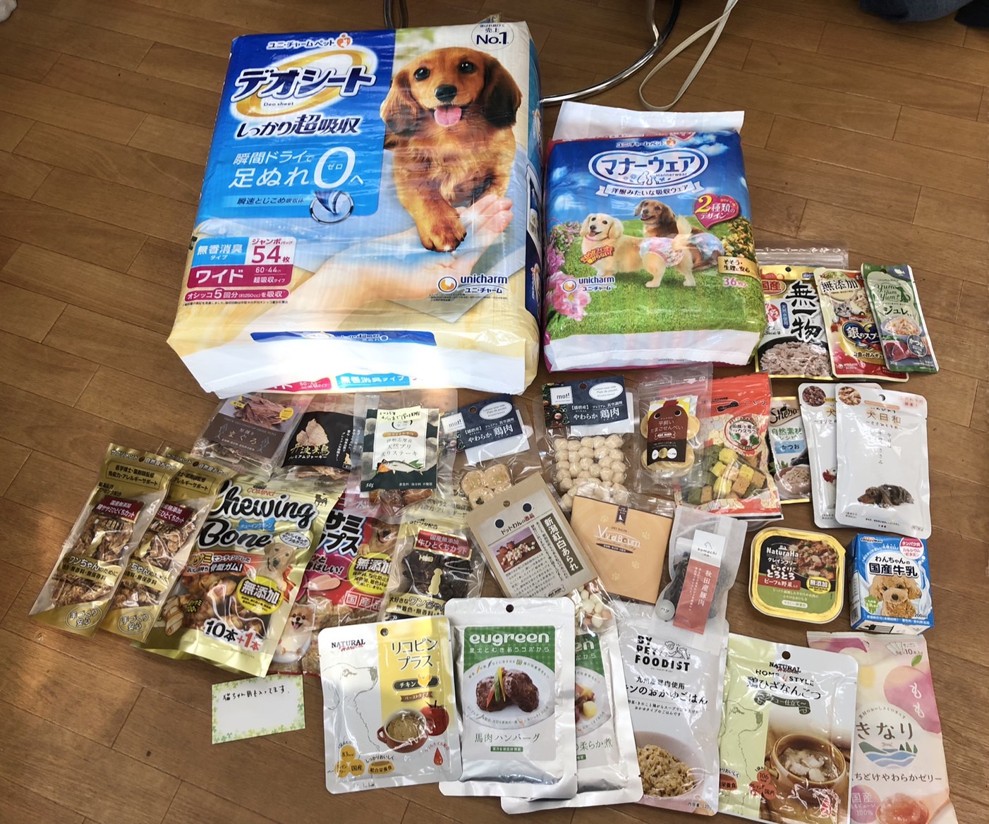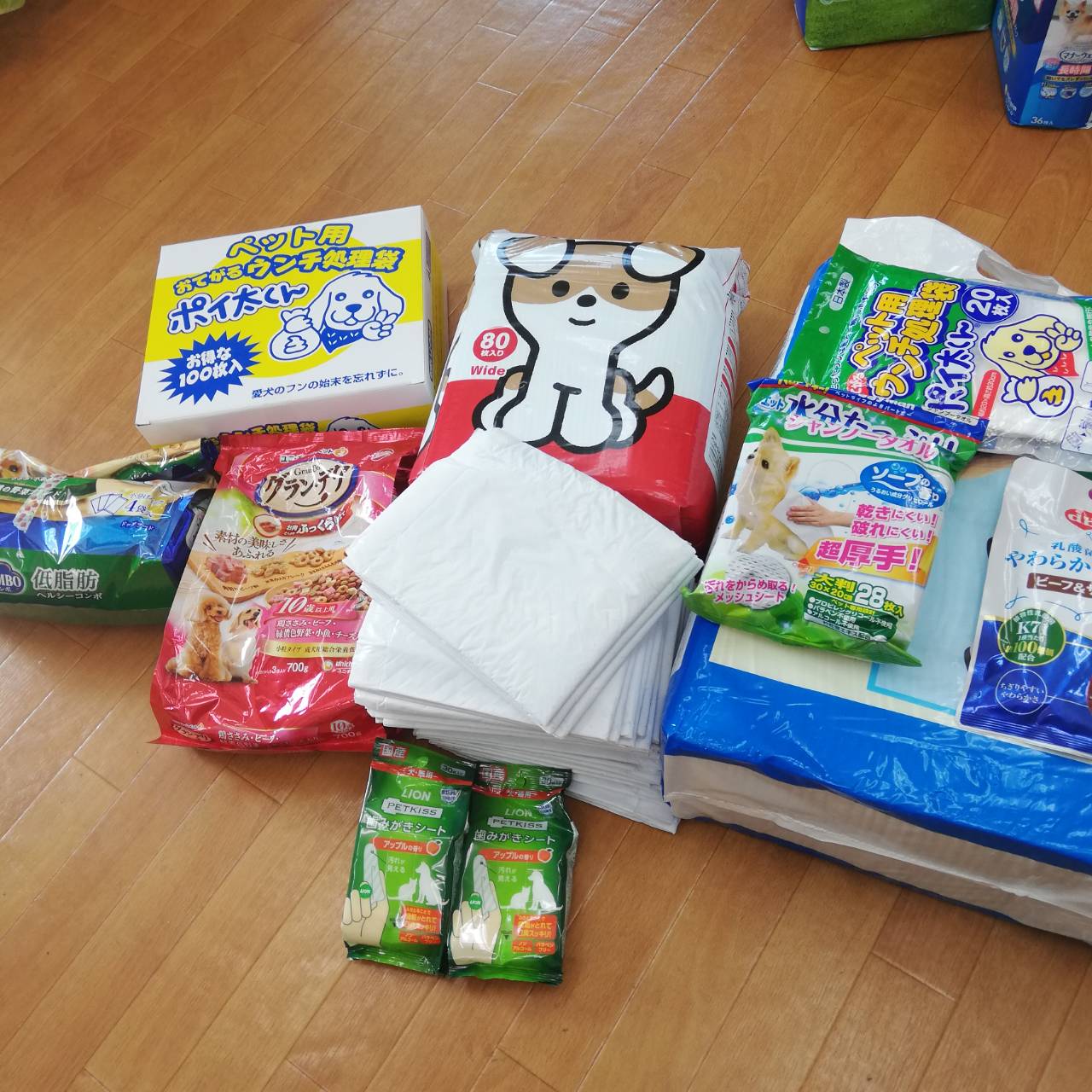 トイレシーツやおむつ、フード類やおやつなど沢山のご支援をいただきました。