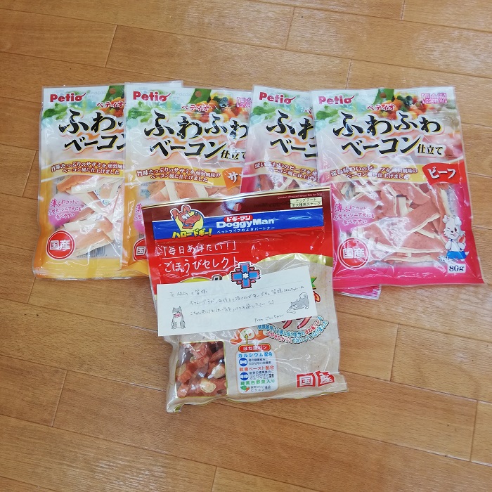 海老名市のごんちゃん様より、ワンコ達に国産おやつのご支援を頂きました。