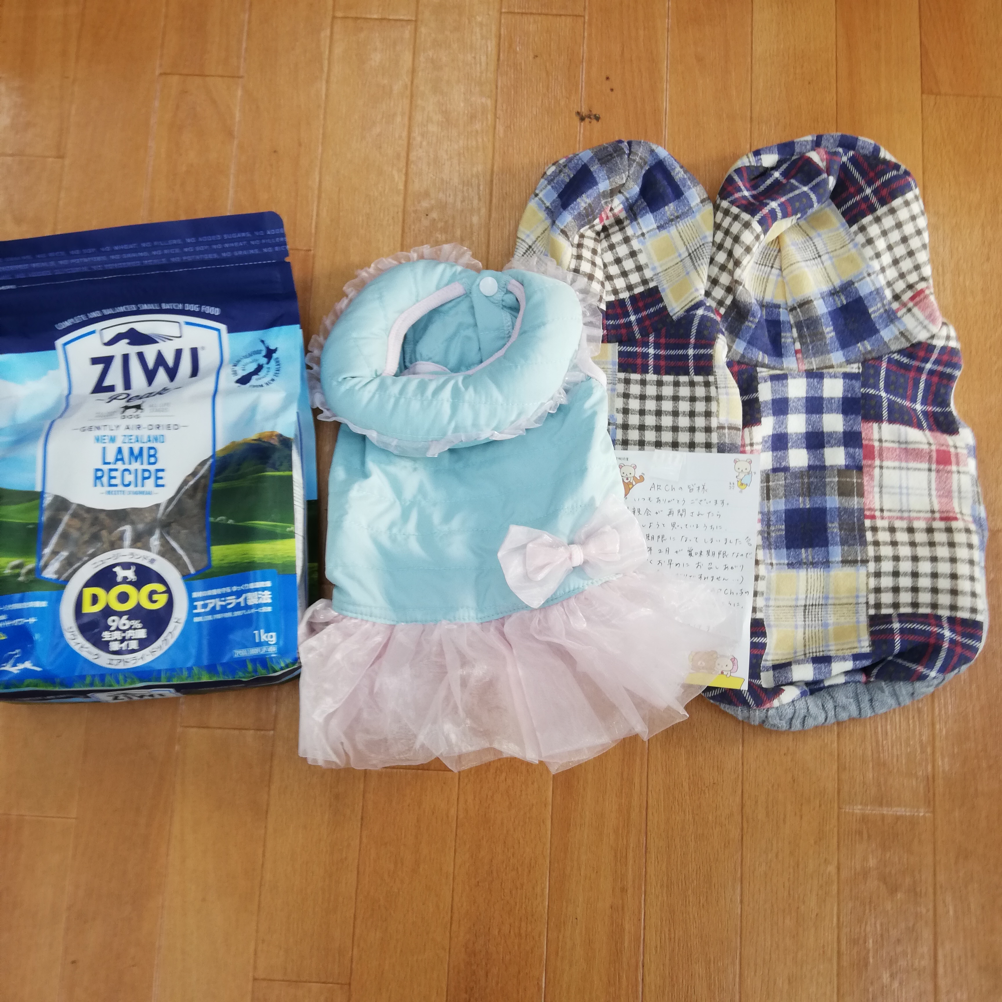 サポートファミリーの横浜のモコノアまま様から、おいしいフードとかわいいお洋服を頂きました。