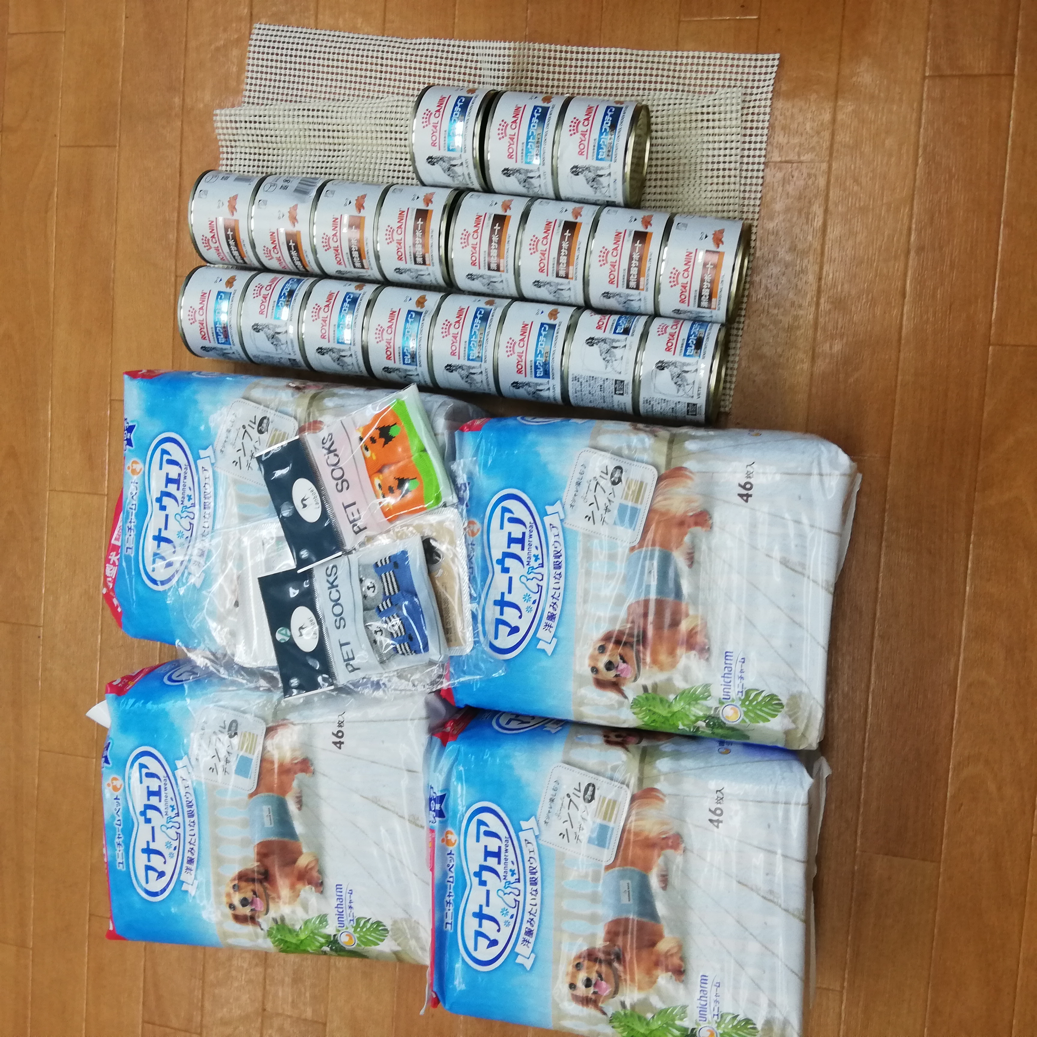 京都の山本様から、処方食の缶詰やオムツ、ソックスなどのご支援を頂きました。Sサイズ男の子用オムツ、ふくまるなどが使用しています。消耗品大変助かります。
