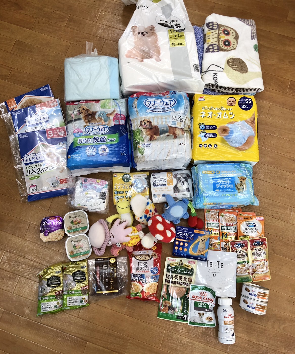 おむつやシーツ、ちゅ~るやレトルトフードなどご支援いただきました。