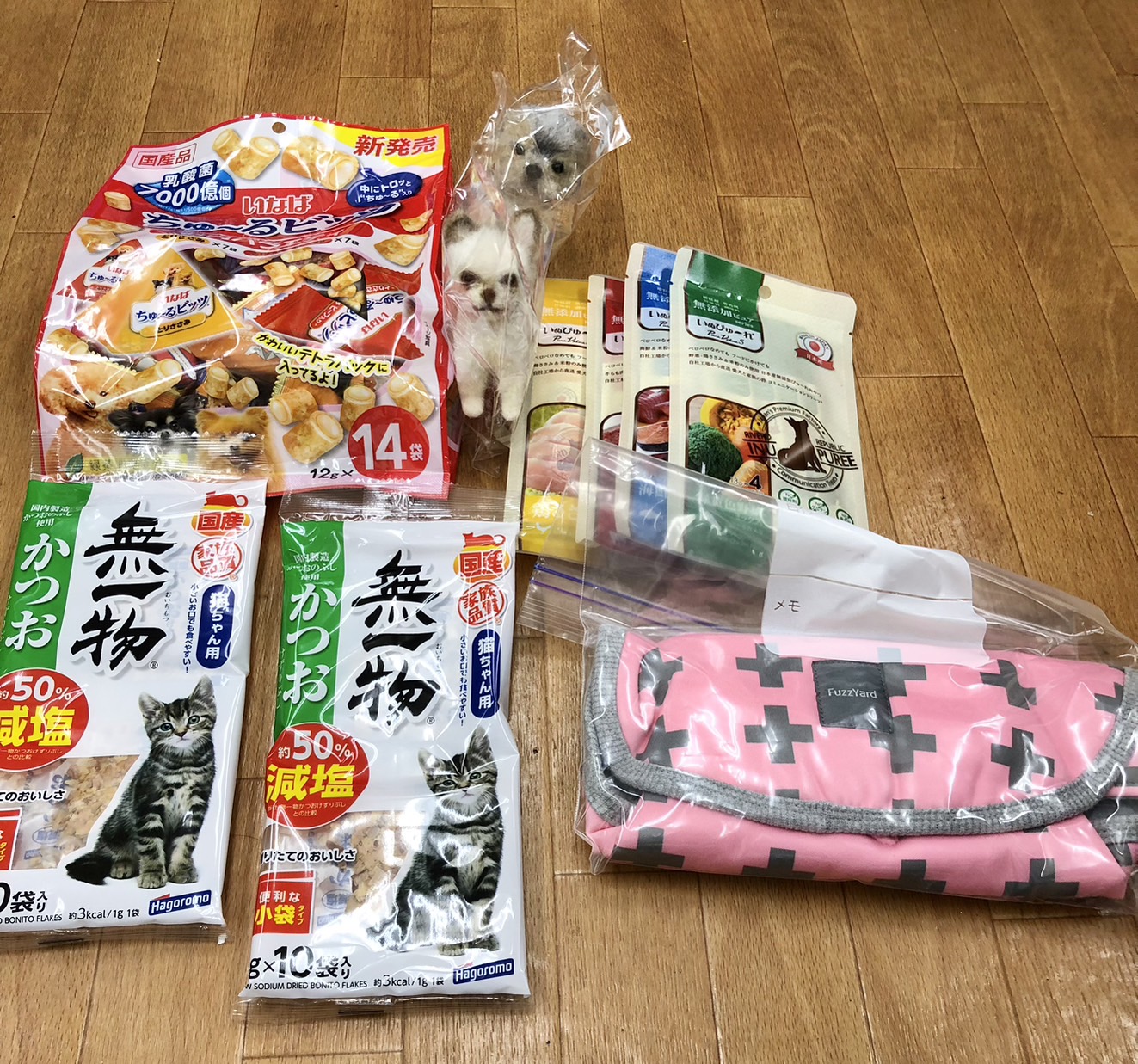 お洋服やちゅるビッツ、にゃんこおやつなどのご支援をいただきました。