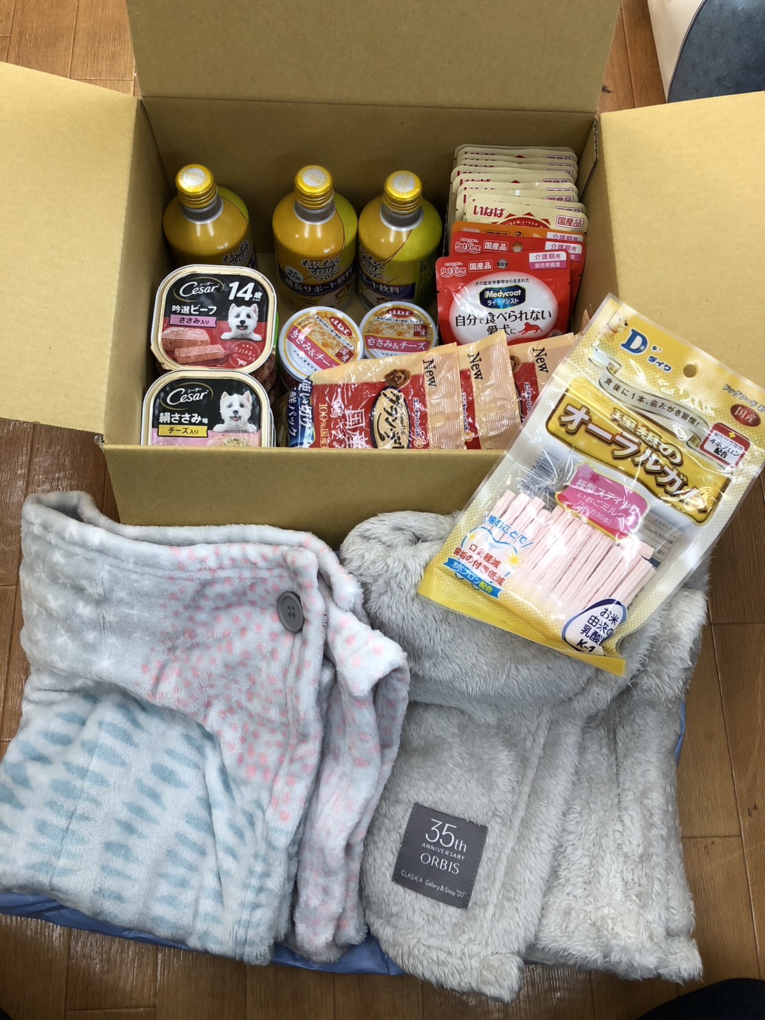 レトルト&缶などのフードやおやつ、毛布などご支援いただきました。