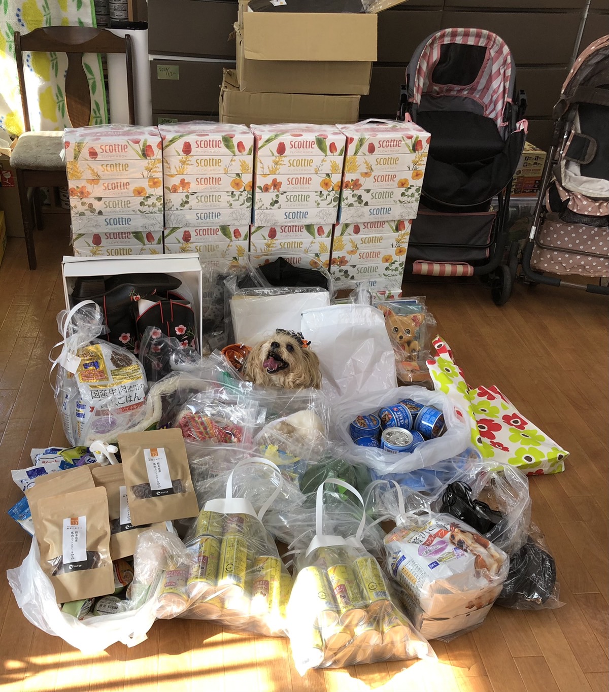 習志野市の竹内ココさま から 愛犬さんにご用意されていた、フードやおやつ、オムツなどたくさんのワンコグッズを頂きました。