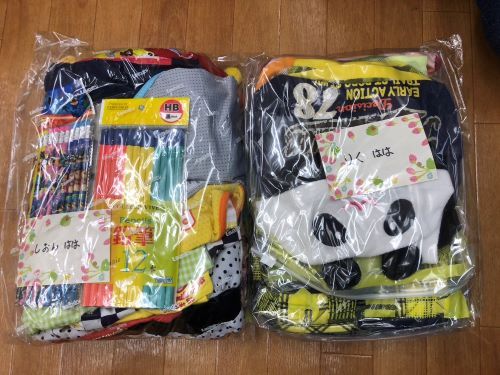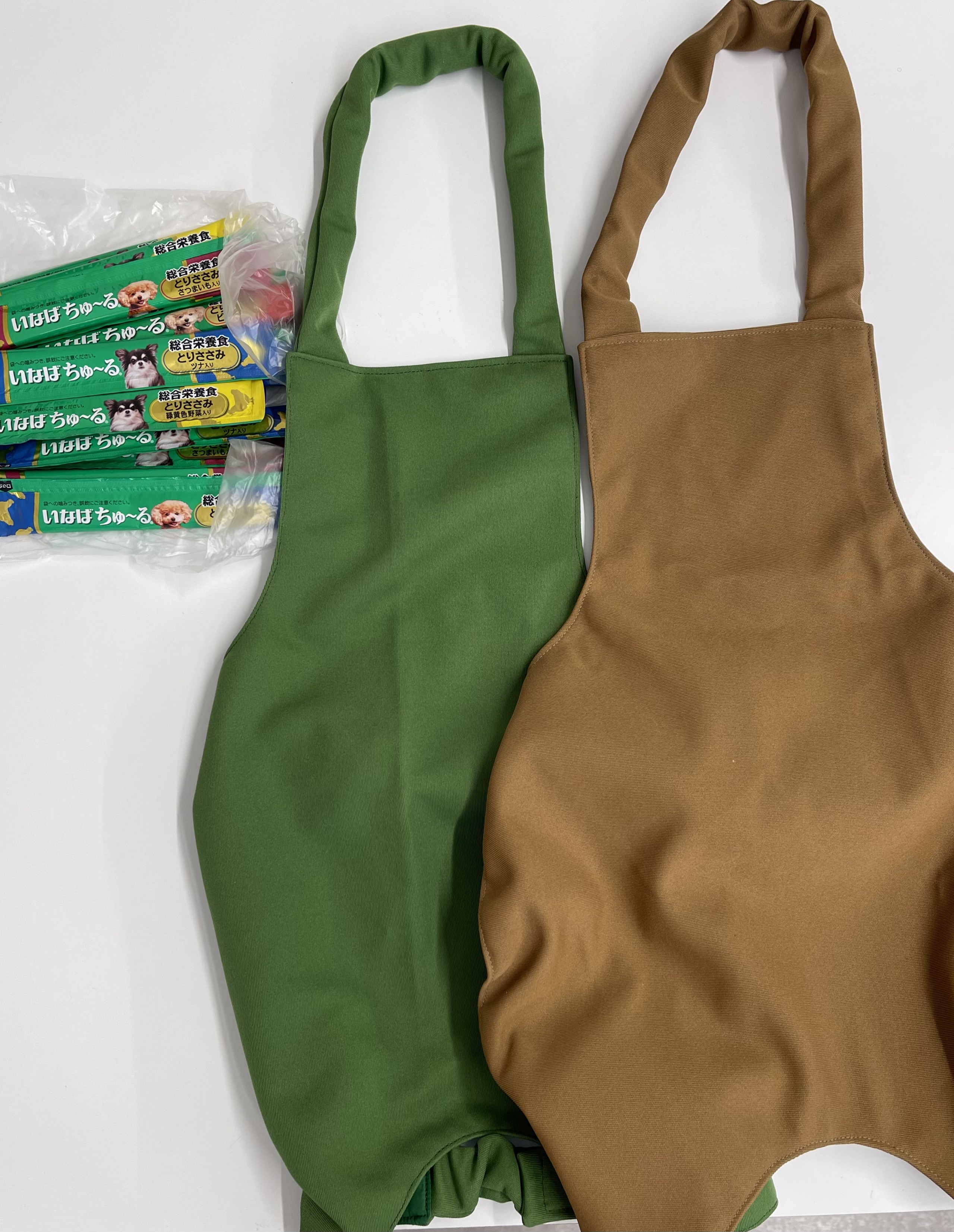 手作りのお散歩エプロンを2枚とおやつなどご支援いただきました。