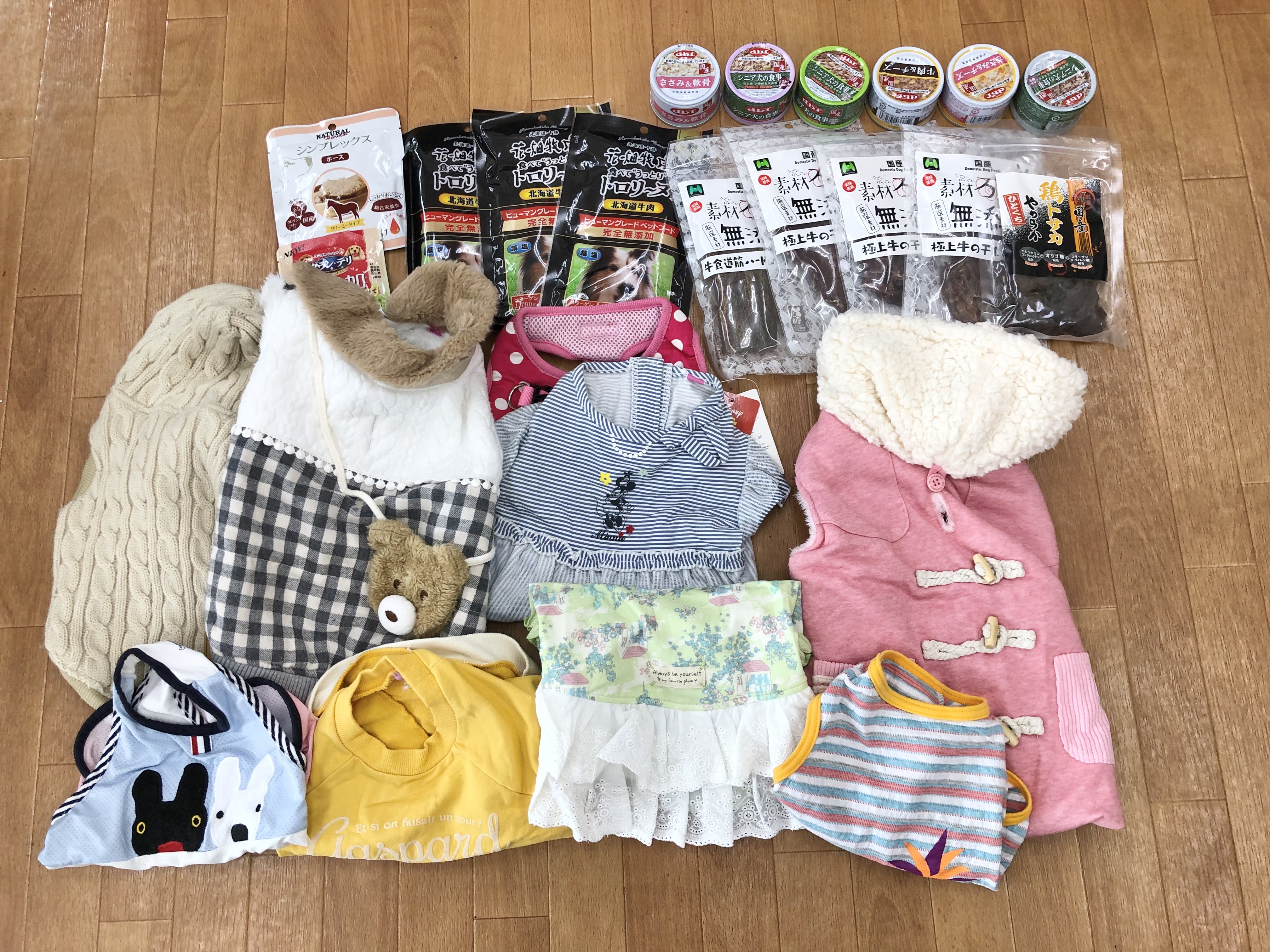 可愛いお洋服とオヤツや缶詰などたくさんのご支援をいただきました。