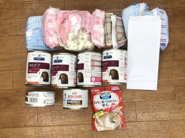 消化器サポート缶、i/d缶とおむつなどご支援いただきました。