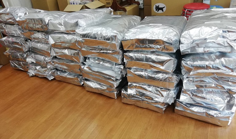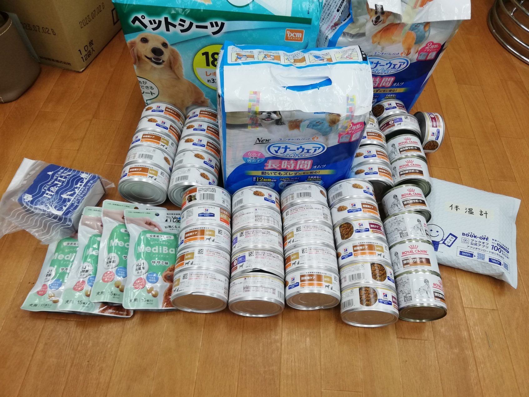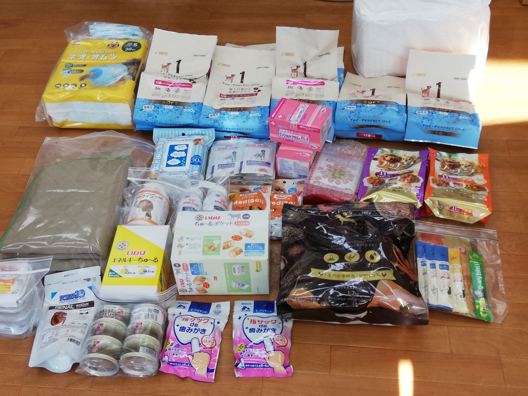 八千代市の古閑アレックス様より、愛犬さんの為にご用意されていた処方食フード、メディボール、ペットシーツ、オムツ、体温計セットなどのたくさんのご支援を頂きました。