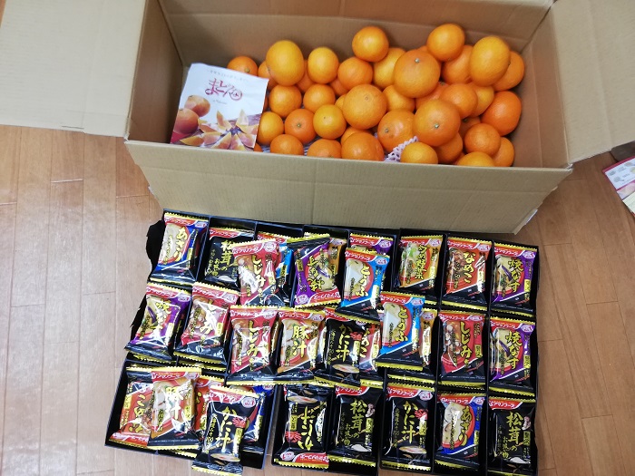 スタッフへ、とおいしい柑橘とアマノのお味噌汁たくさん、の差し入れを頂きました。